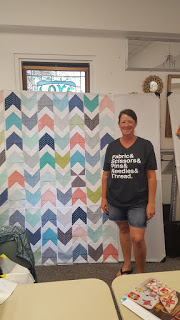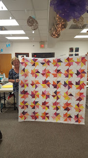 After a spray-basting demo by Linda T., Cindy was thrilled to have all these half-square triangles put together and ready for quilting