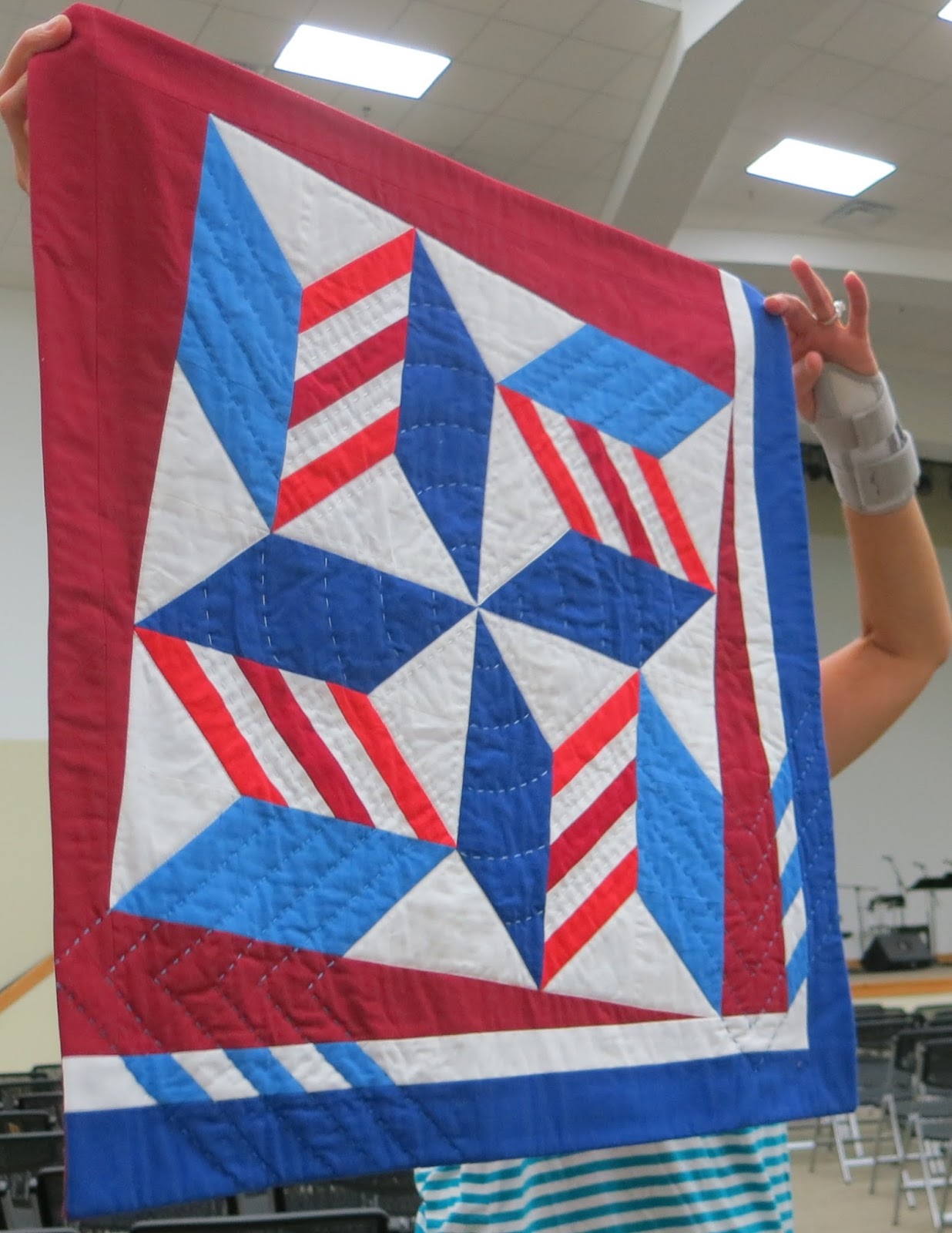 | Patriotic Pinwheels is an original design by Linda using Painter’s Palette Solids. She quilted it with a combination of machine quilting and big stitch hand quilting using size 8 perle cotton. |