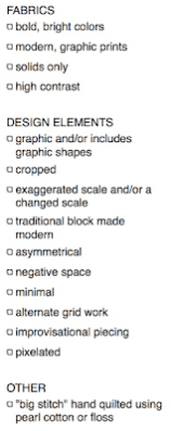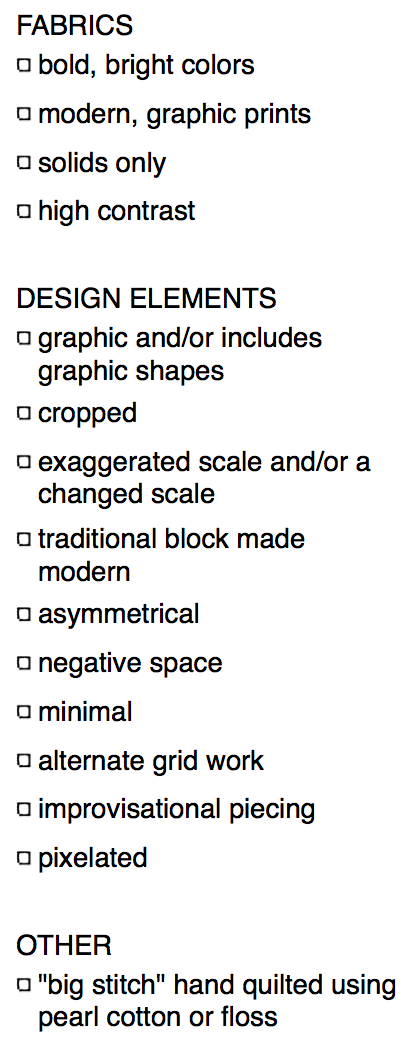 Rather, many suggestions were made about how each quilt might be changed or remade to become more modern. Using the checklist (at right) as a guide, members chimed in to offer a variety of ideas for each quilt.