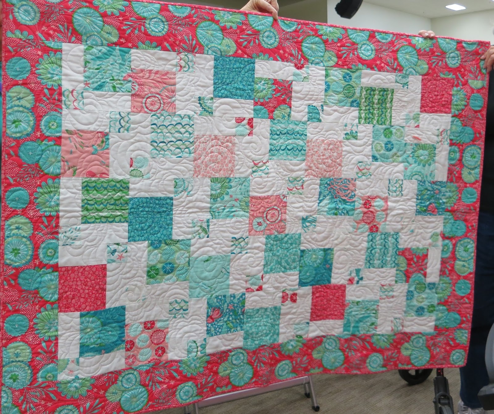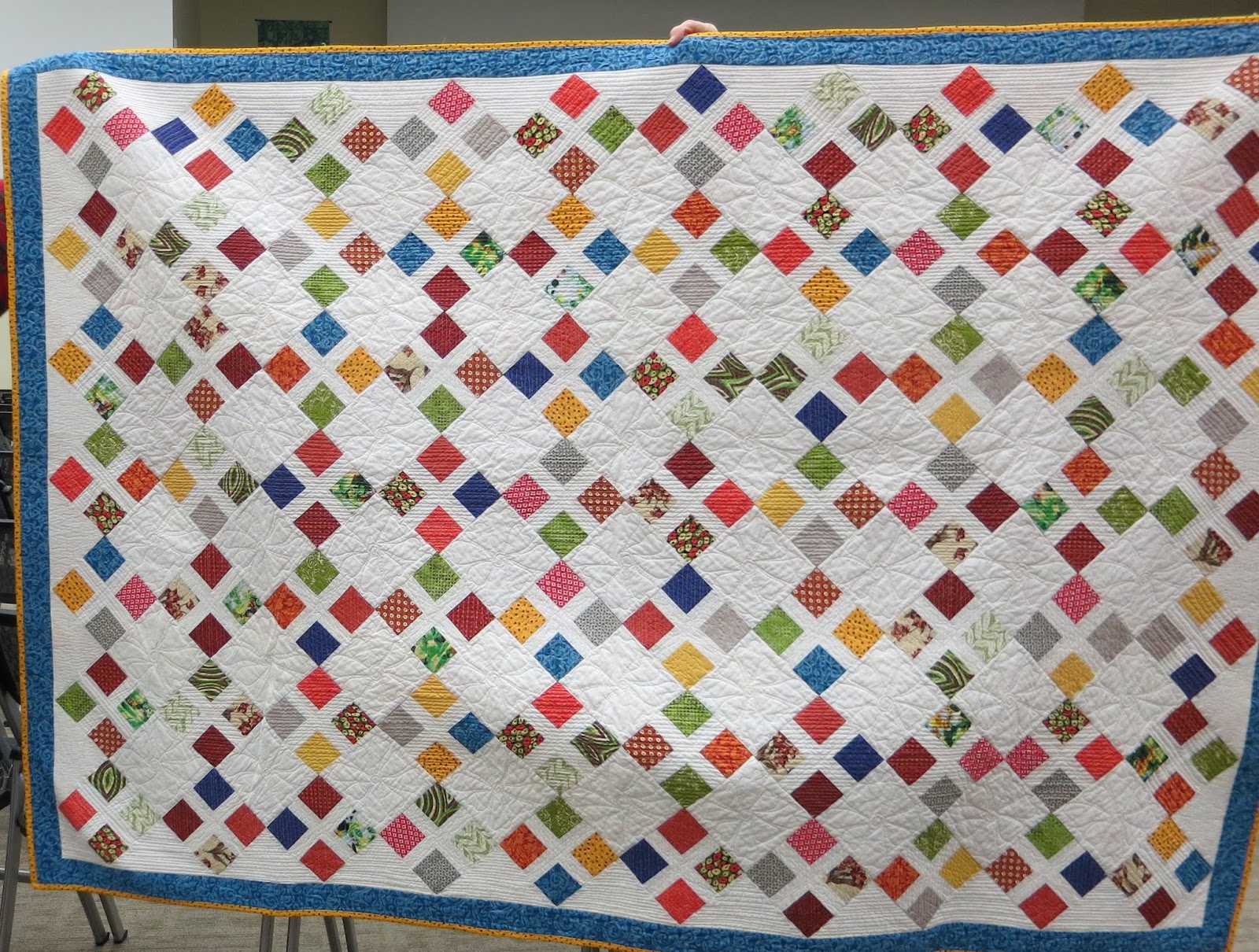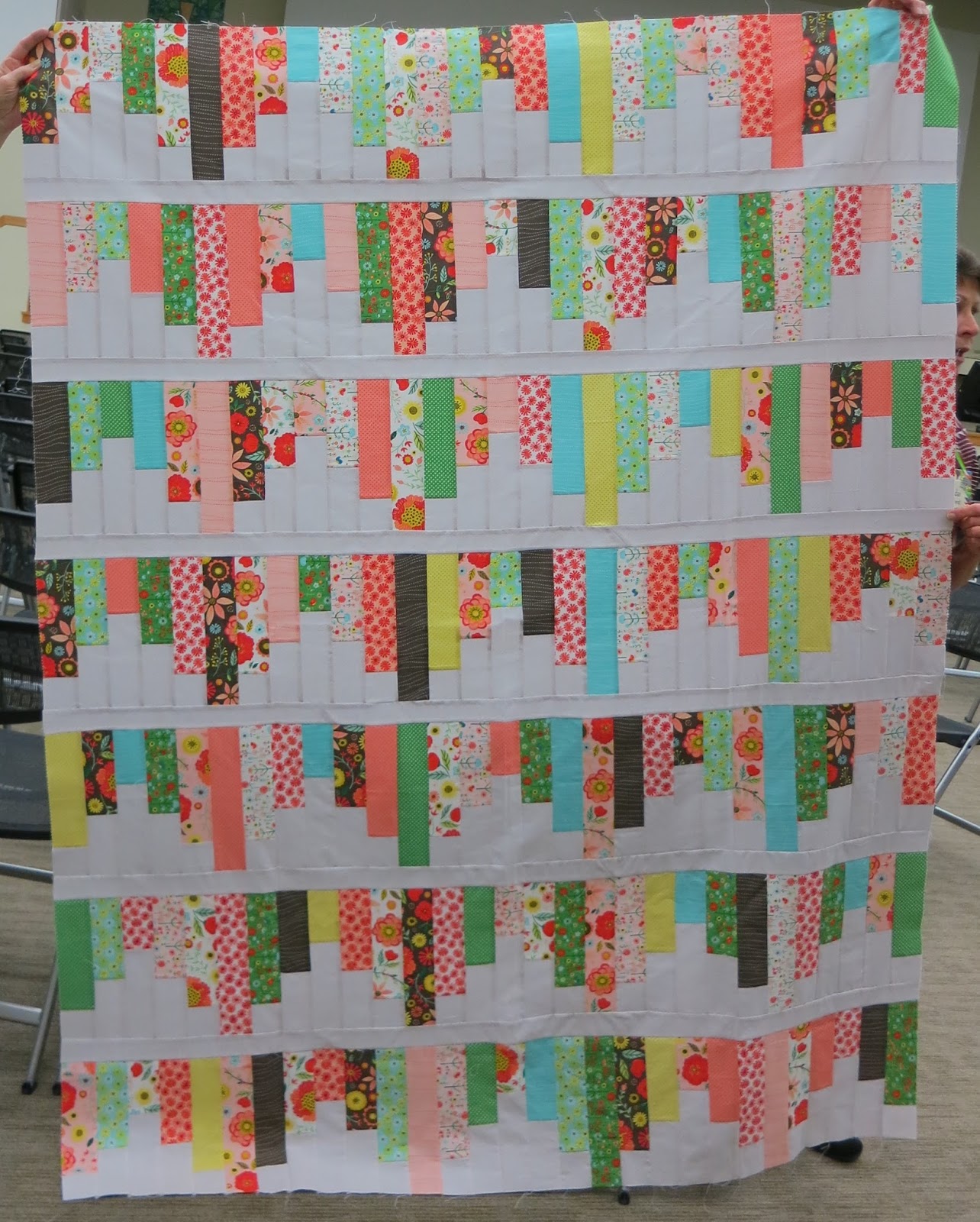 Suggested changes: Since this is still only a quilt top, cut it apart and insert random strips of different colors of bright solids.
