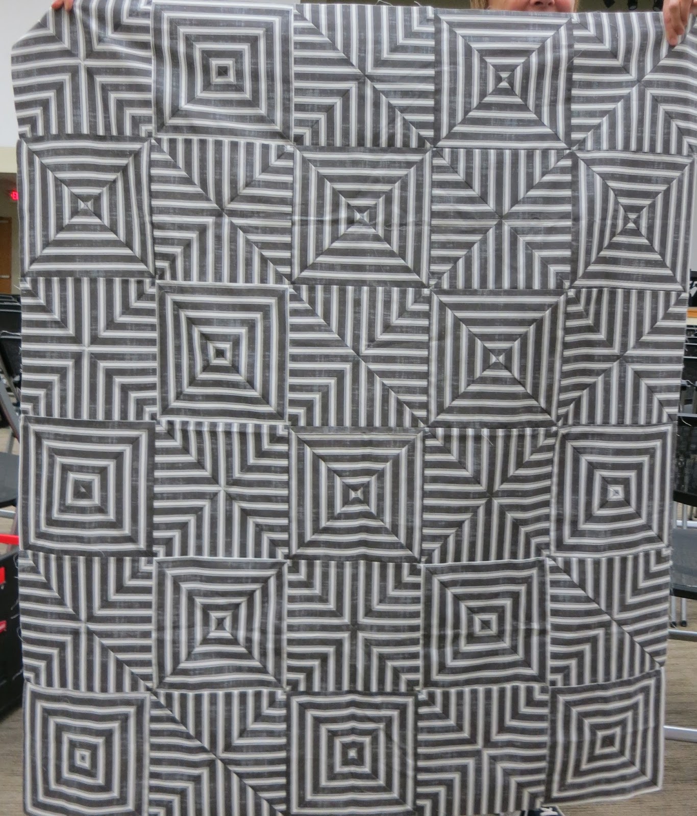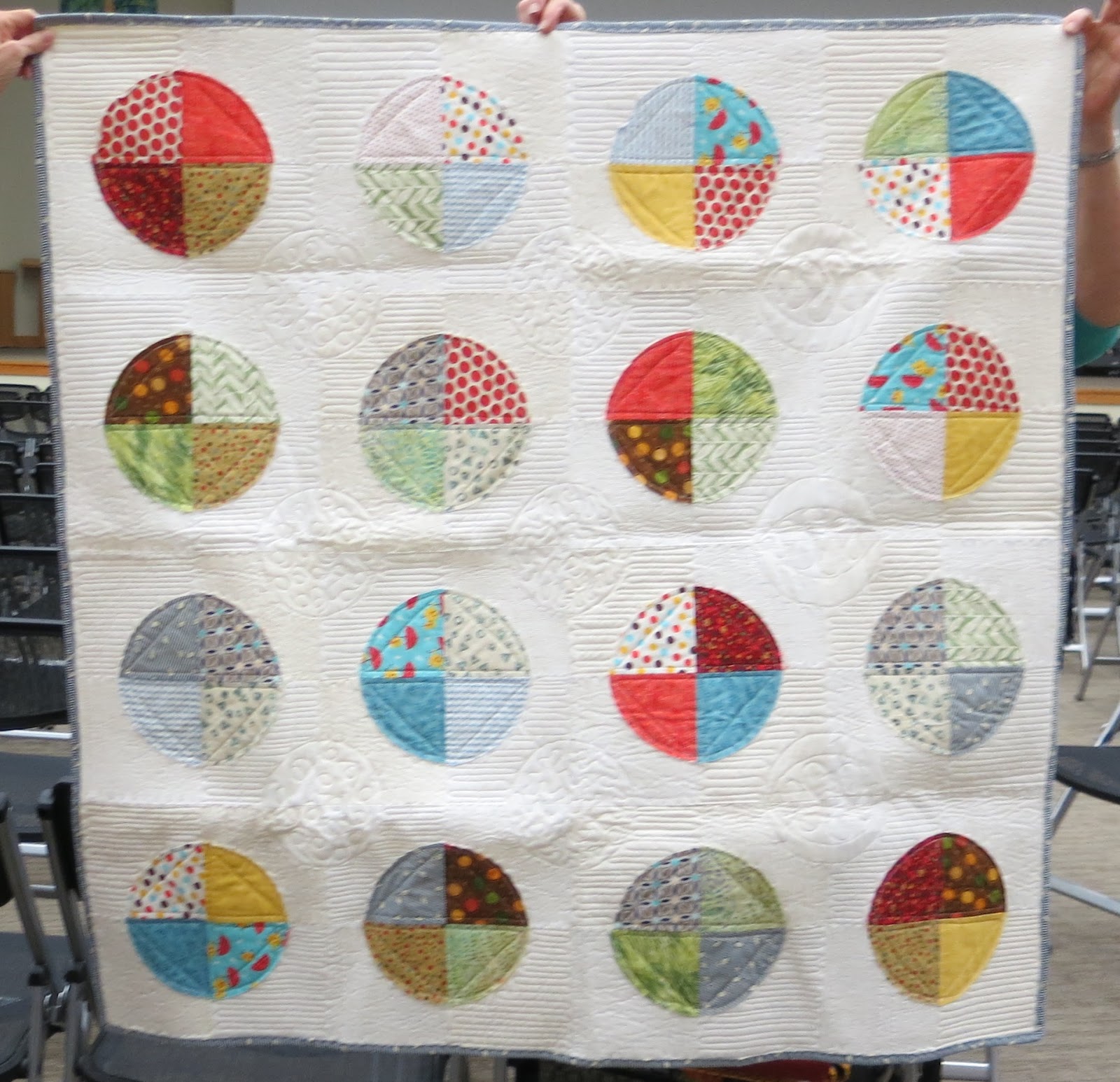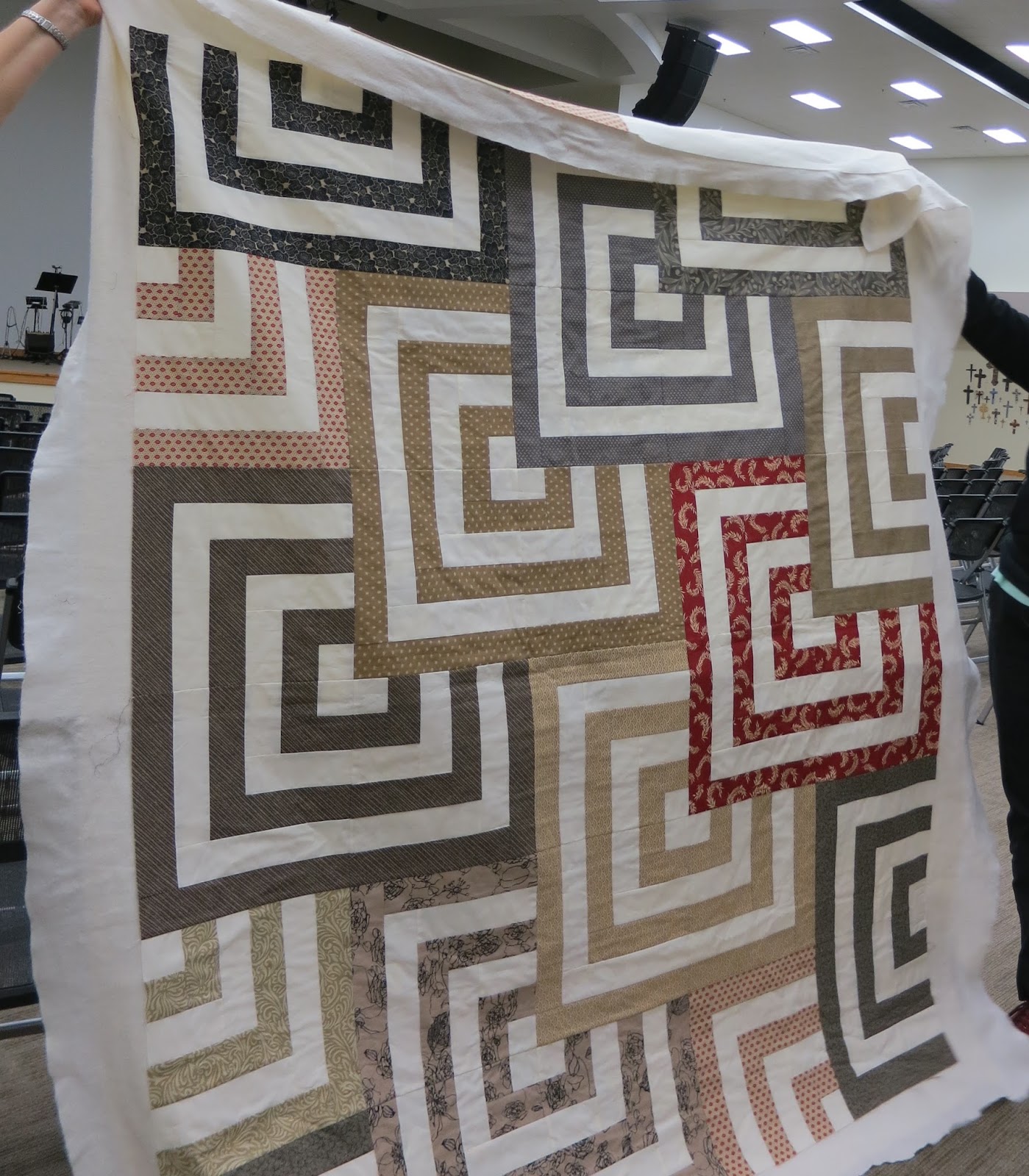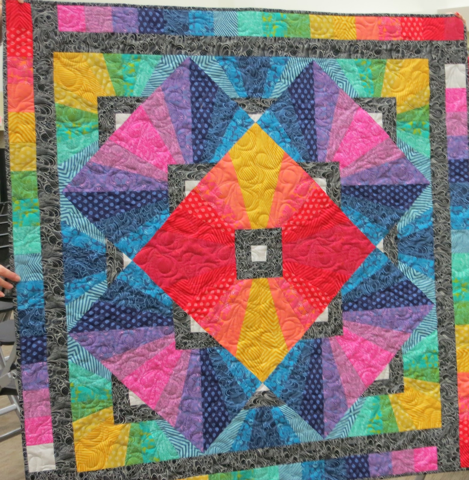 Suggested changes: Since this is still only a quilt top, cut it apart and insert random strips of different colors of bright solids.