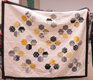 Suggested changes: remove border; add asymmetry; leave out hexagons in random places; add ghost quilting