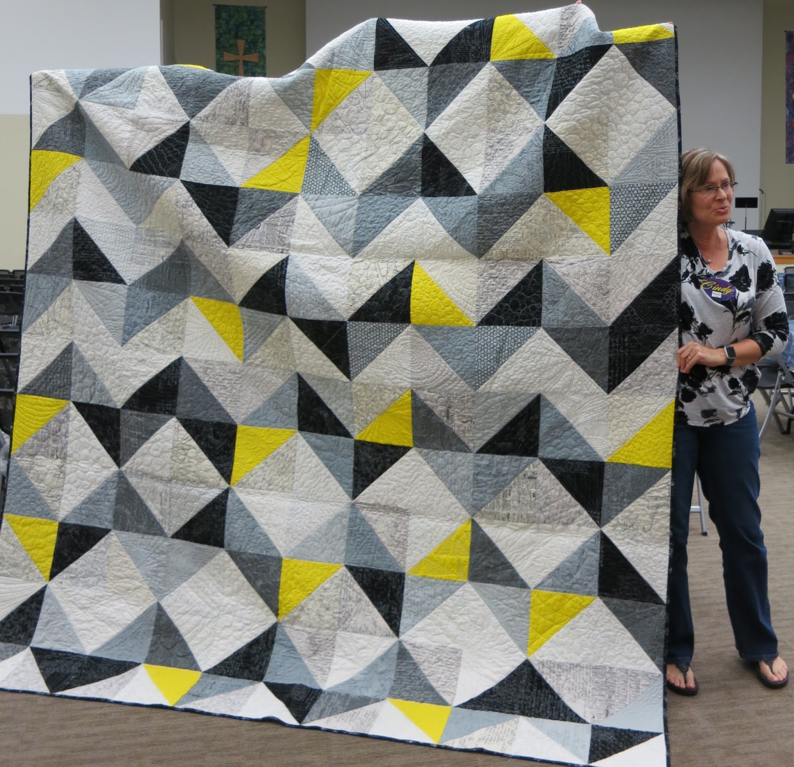 Cindy also showed her big “Chevron News” quilt. She domestic machine quilted it using many different quilting designs. Great work!