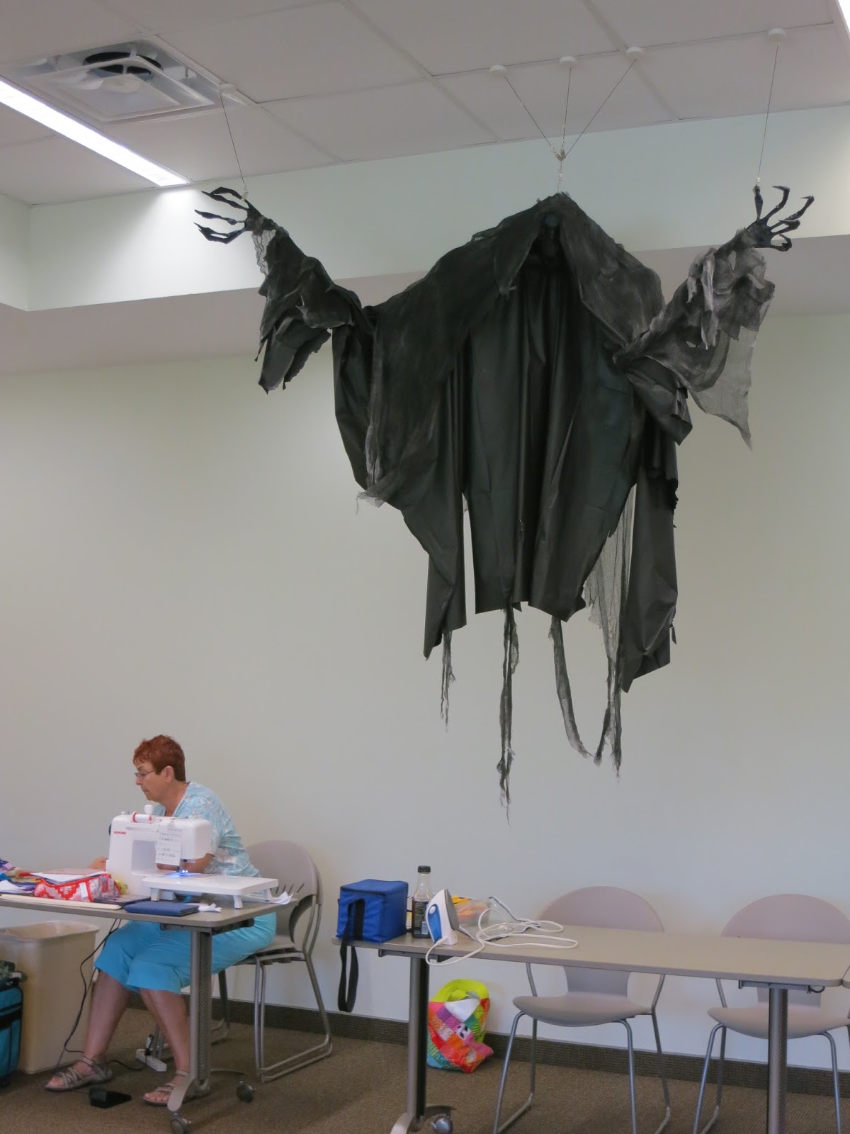 We enjoyed sewing together on Saturday at the Belleview Public Library. The library had recently celebrated a Harry Potter-themed event, and one character – a Dementor – remained behind to keep us company.