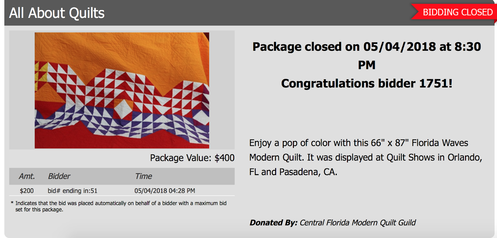 Our 2018 QuiltCon Charity Quilt, “Florida Waves,” was put up for auction with a value of $400.