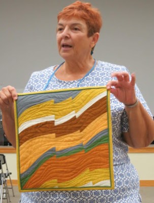 Two of our visitors are a mother/daughter combo – Adriana and Bea – who are launching a Kickstarter program for their new ruler business. They explained their new ruler, which has two pins that are depressed to “lock” fabric to the rotary mat for no-slip cutting. Members were invited to give it a try, and did!