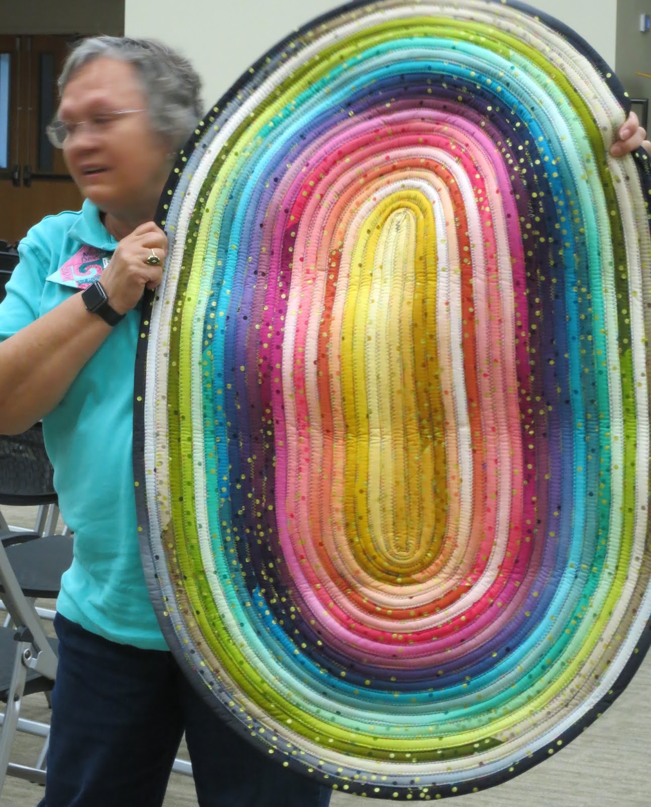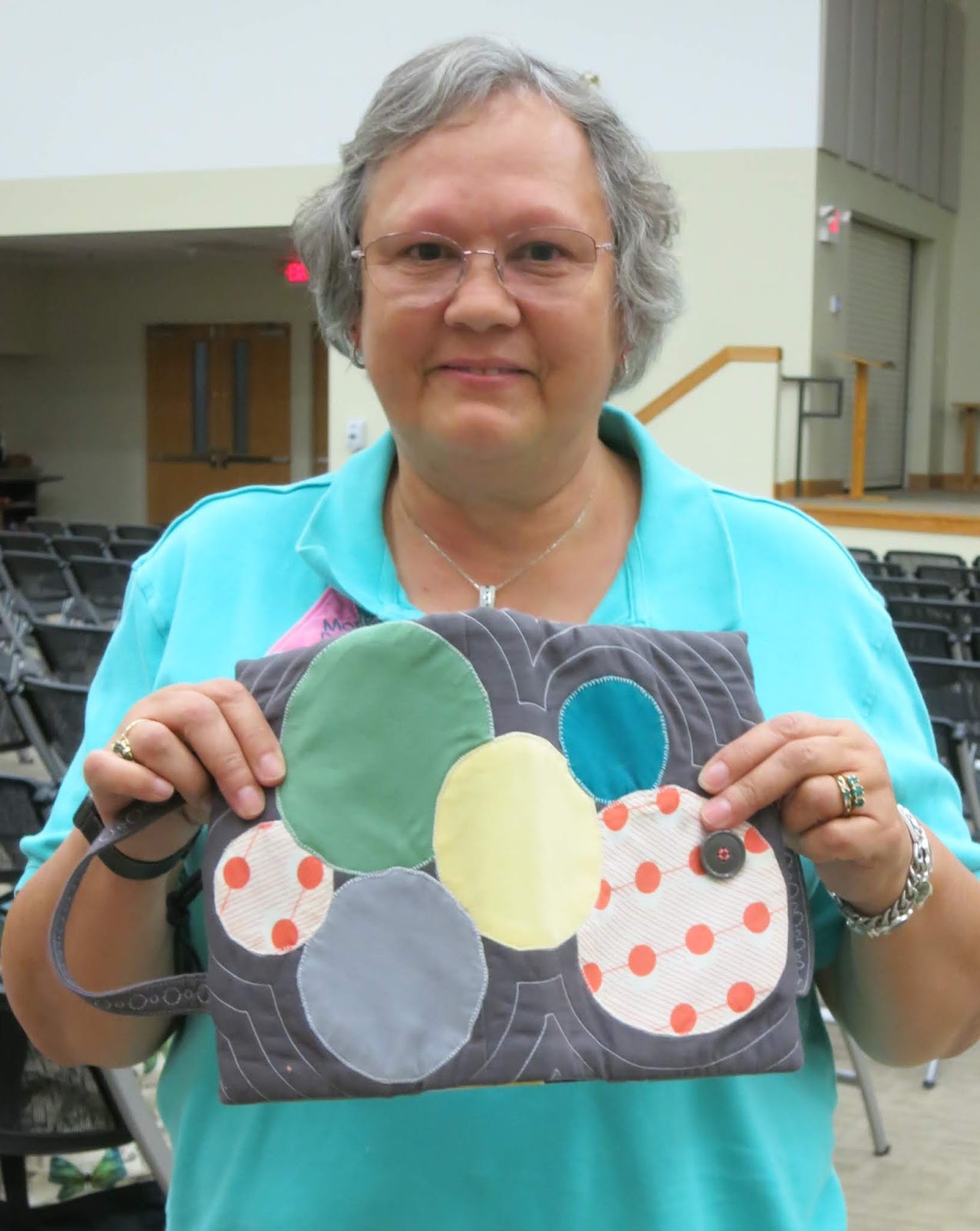Marie showed a journal cover she made using the appliqué shapes she made since learning Selina’s technique for appliqué curves/circles, taught at last month’s meeting.