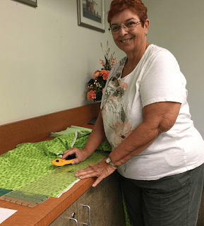 Then, during the August 11 Sew-In, Jane, Beth, and Dee cut fabrics to make kits for 12 blocks.