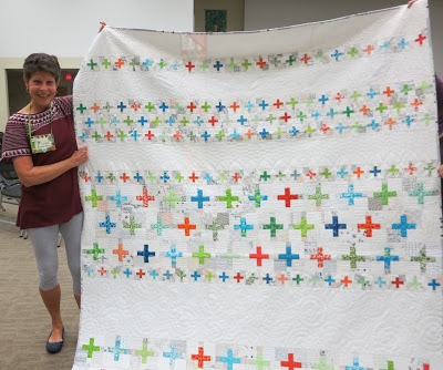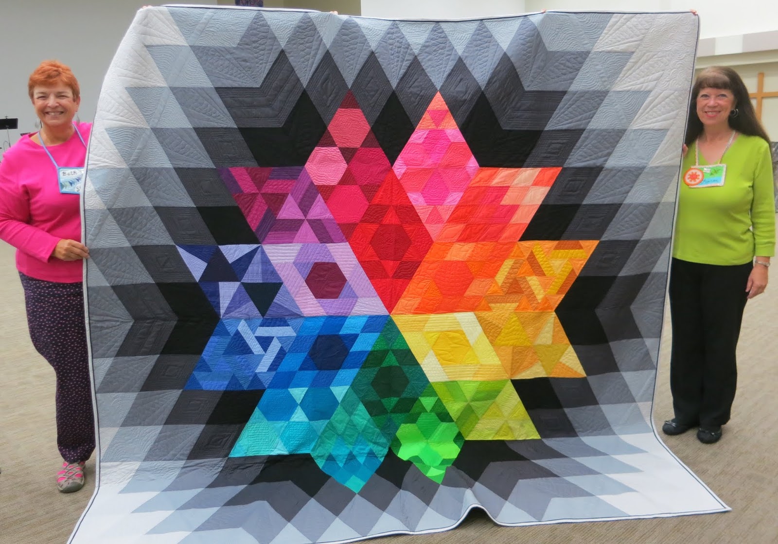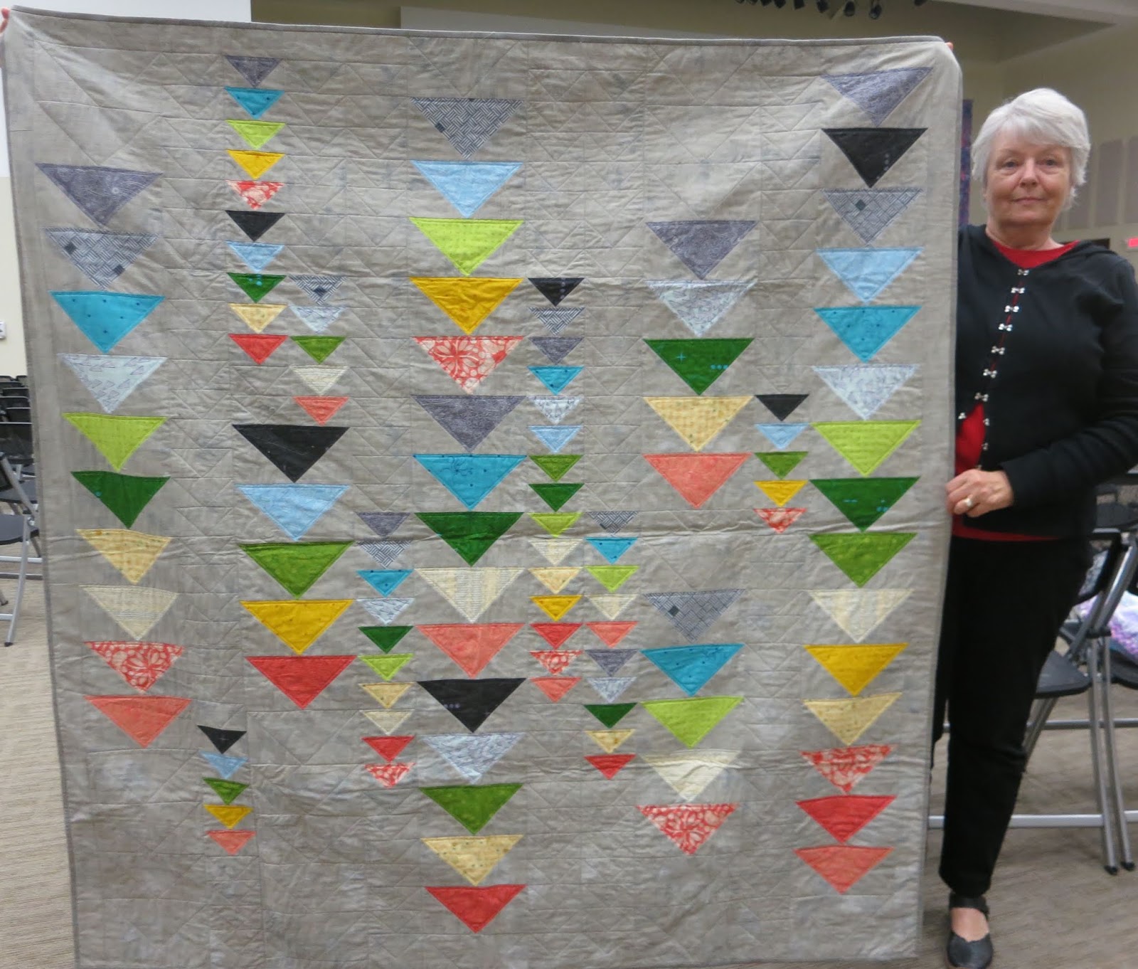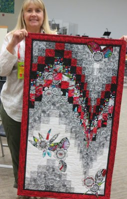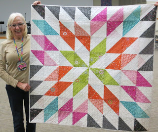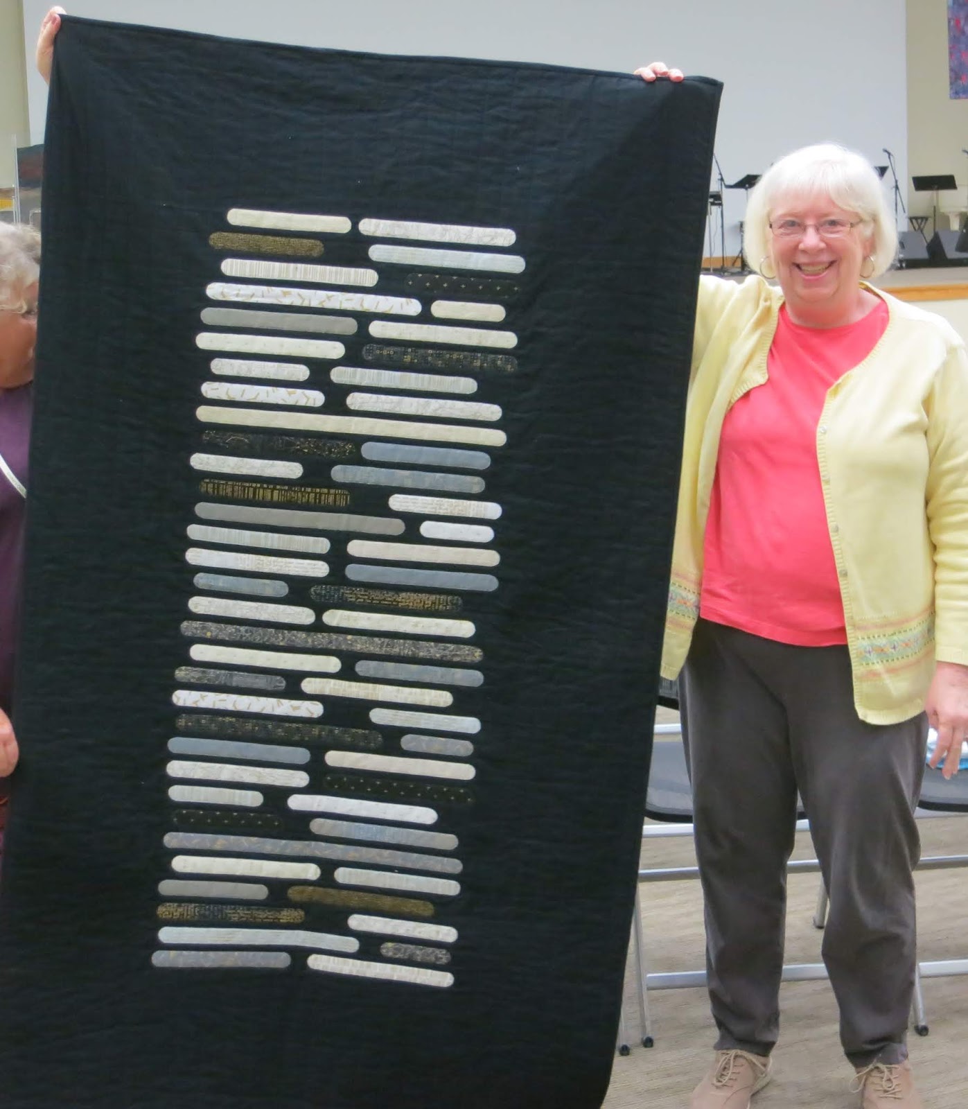 “Starburst” is a Jenny Doan pattern made with layer cakes. Dee quilted all her quilts on her home sewing machine.