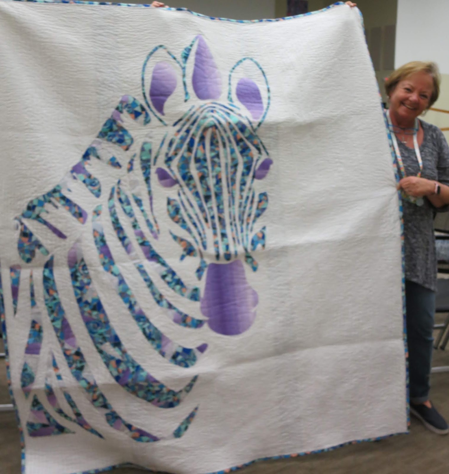 Karen T. (@yorkie3mom) finished this scrappy appliqué zebra quilt started during a fall 2018 workshop with Shannon Brinkley. She quilted it on her home sewing machine.