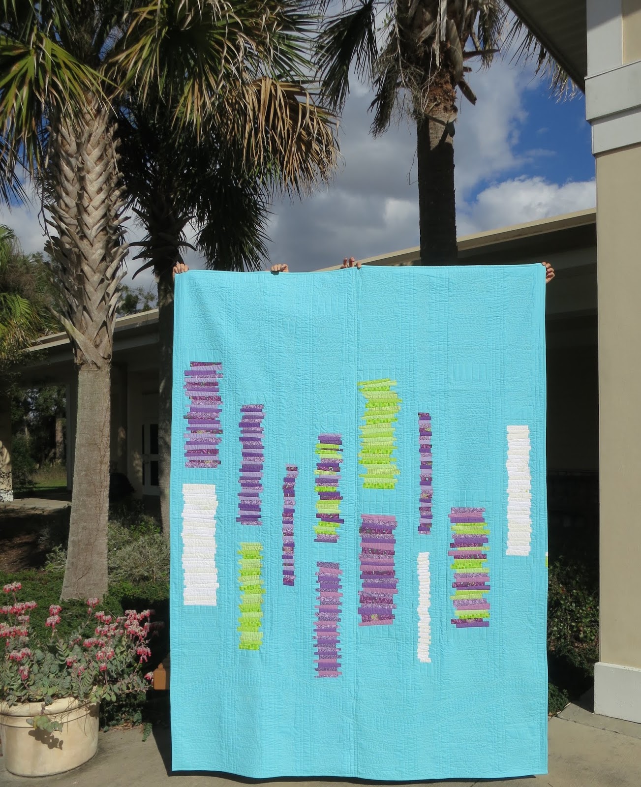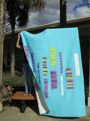 The wonky, improvisational wedge design was inspired by Elizabeth Hartman’s “Xylophone” quilt pattern. Permission to use was given by Elizabeth.