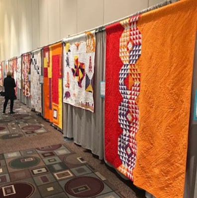 The Modern Quilt Guild (MQG) determines the parameters for the challenge – design theme, fabric colors, and quilt dimensions. Each chapter’s challenge is to make the quilt, and then ship it to QuiltCon. Charity quilts are displayed around the perimeter of a lecture hall, and/or along the hallways to the show room and classrooms.