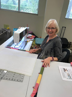 | Karen has started sewing the strips onto the foundation… |