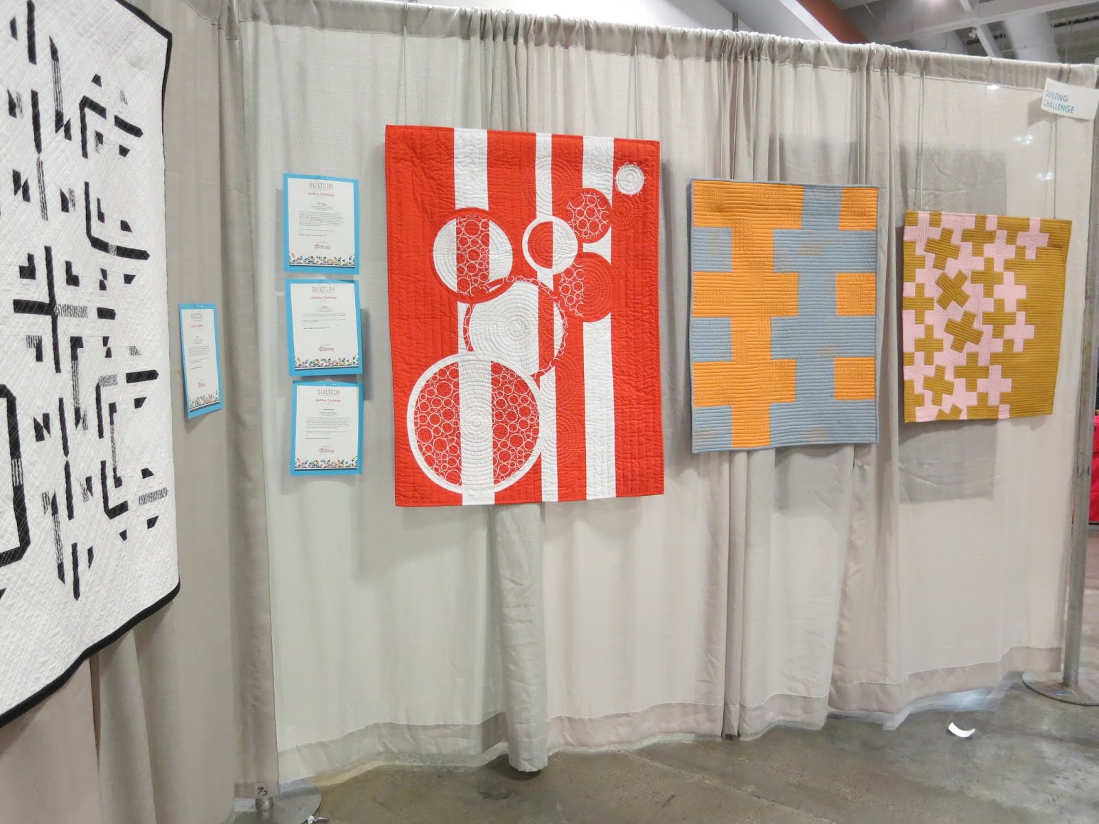 Beth’s two-color challenge quilt, “Twin Peaks” is on the right, beside Steph Skardal’s “Super Donut.”