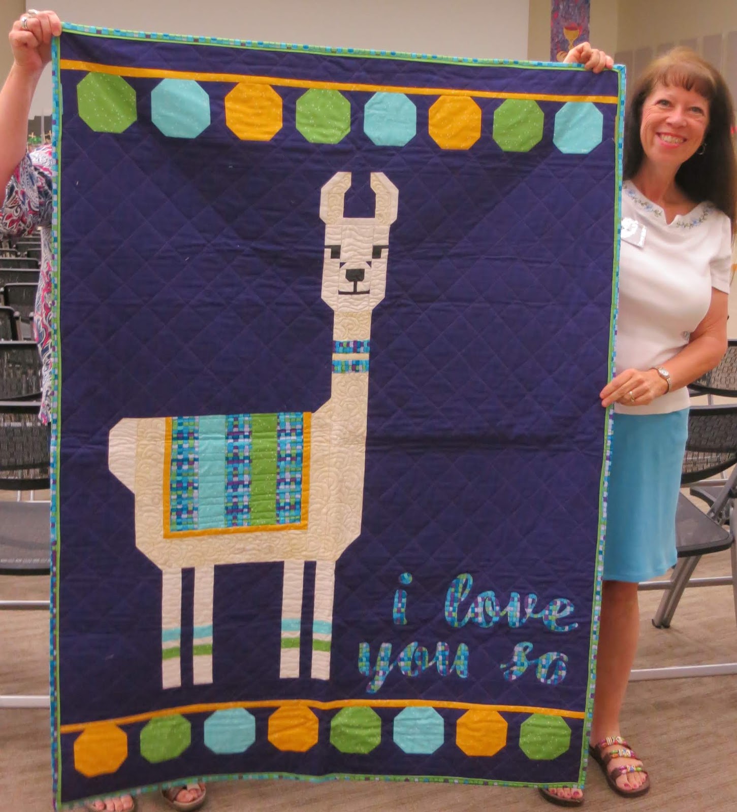 President Karen made Elizabeth Hartmann’s “Lloyd and Lola” – this is Lola! – a 43″ X 58″ llama quilt for her granddaughter. She used a walking foot to quilt it on her Janome 9400QCP sewing machine.