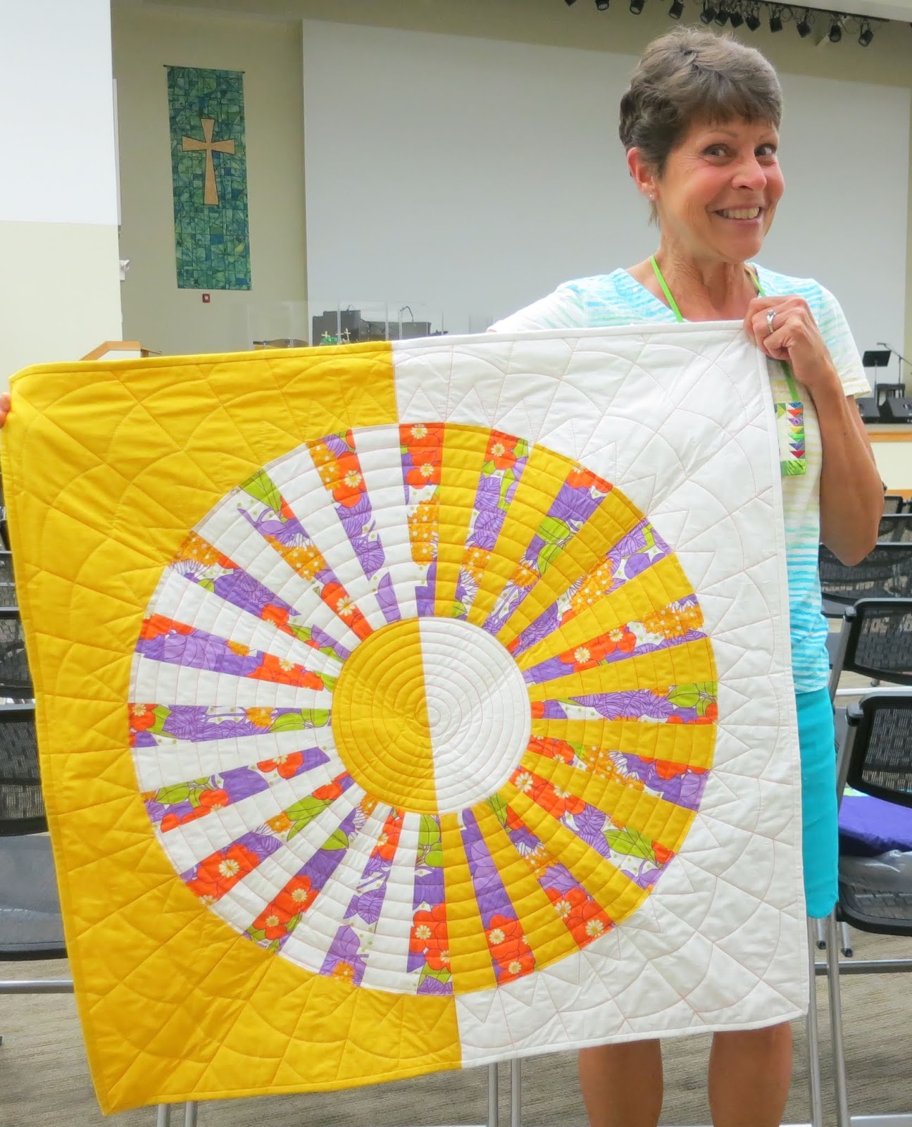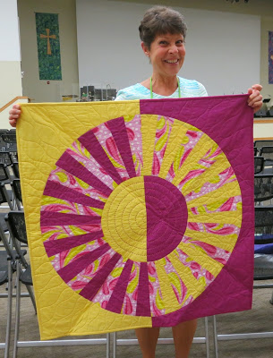 Linda @flourishingpalms showed two quilts made with inspiration from Christina Camelli’s book “Modern Wedge Workshop.” Linda calls the design, “Carousel.” Both quilts are 33″ X 33″ and were made with three fabrics and a 9° wedge ruler. This quilt was quilted on a Bernina 770QE using a wave ruler, with perle cotton big stitch hand quilting in the center.
