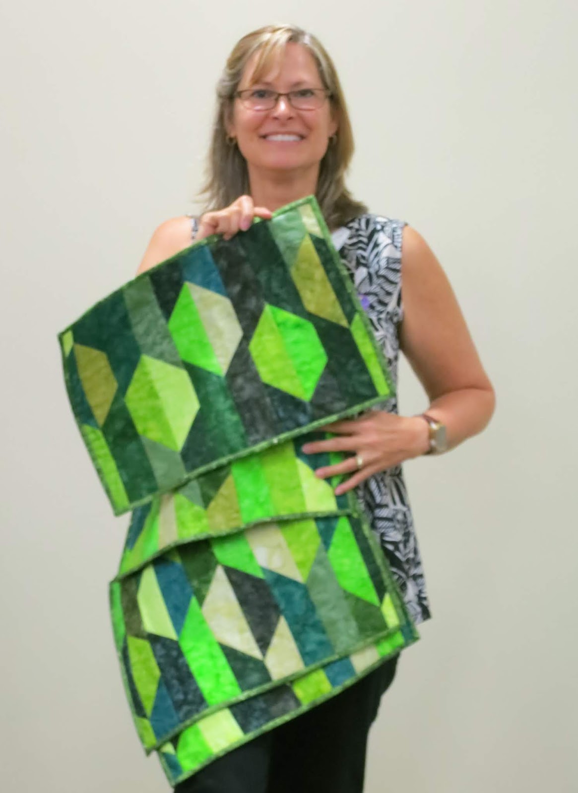 Lynette @netsyclay made four 15″ X 19″ placemats like this using the “Intersection” pattern by Rock Solid. She quilted them on her Janome sewing machine.