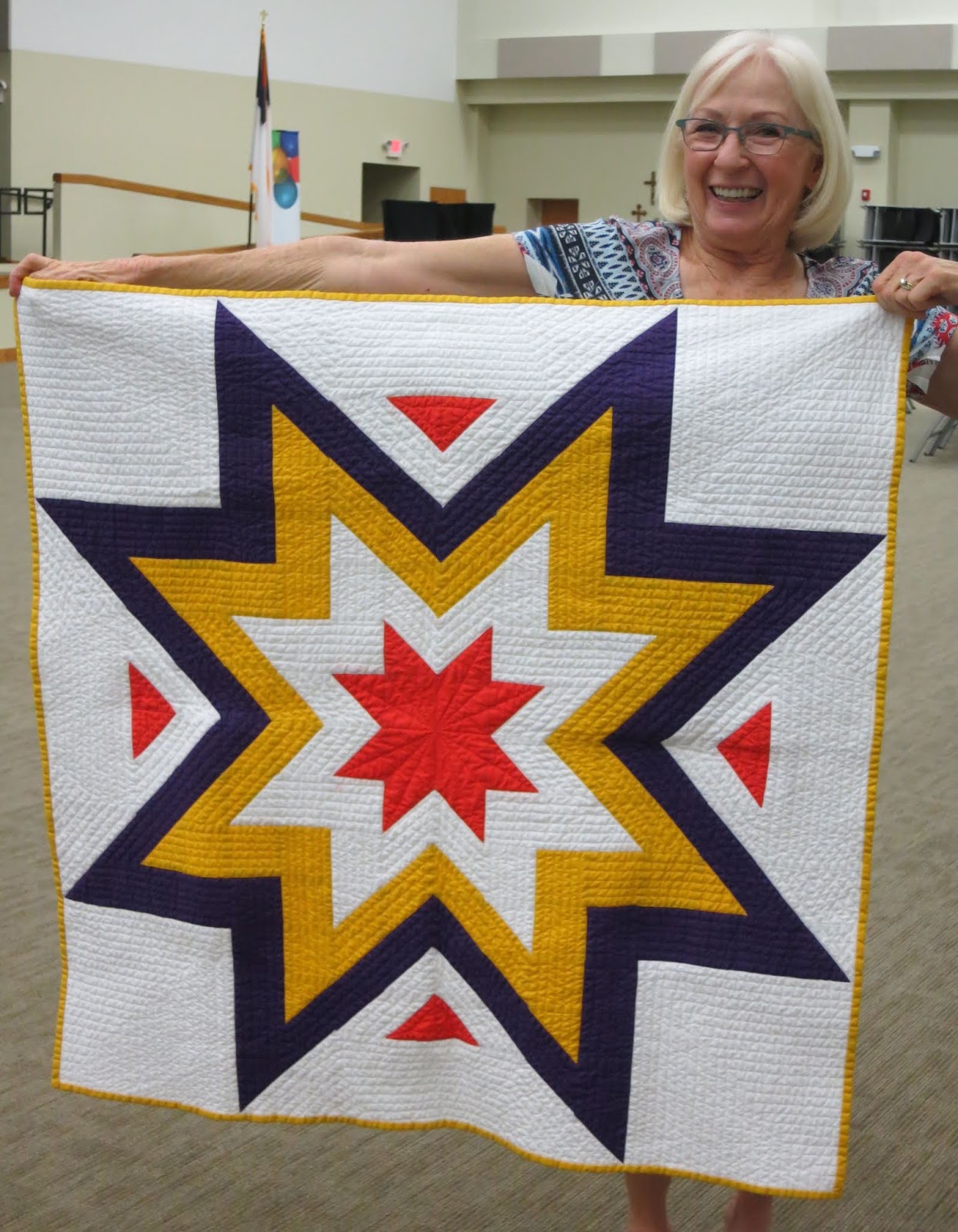 Barb made “First Try,” a 50″ X 50″ quilt from Brigitte Heitland’s design: “Tangerine Dreams.” She hired a longarm quilter for quilting.