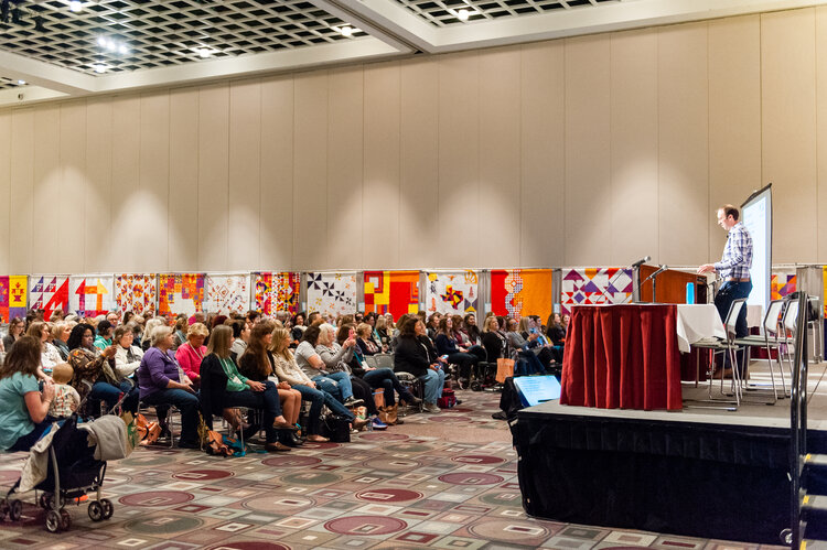 It was taken at the 2018 awards ceremony in Pasadena, California. Quilts along the wall, at the back of the picture are charity challenge quilts. The second quilt from the right is the one we made! 👏🏼 You can see a better picture by clicking the “QuiltCon Charity Quilts” tab at the top of this page.