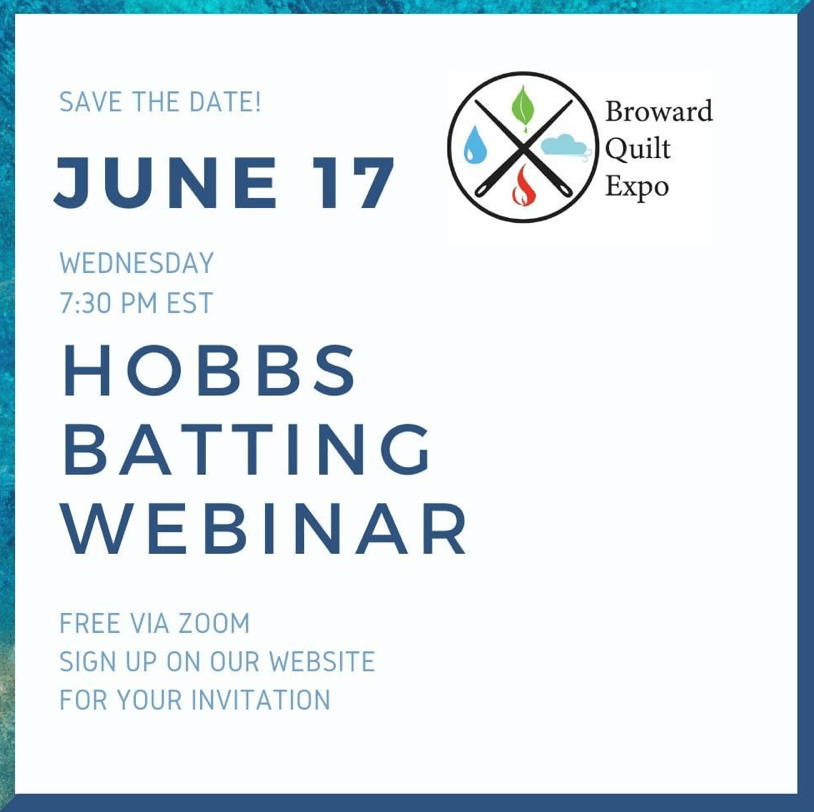 - Florida’s Broward Quilt Expo @browardquiltexpo is hosting a free Hobbs batting informational webinar on Wednesday, June 17 at 7:30 pm. If you’d like to attend, simply go to the Broward Quilt Expo website and enter your email address in the pop-up window. You’ll receive acknowledgment and a Zoom link.