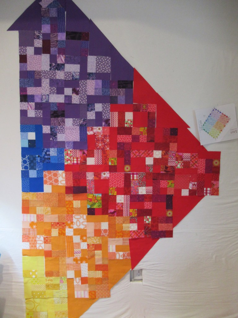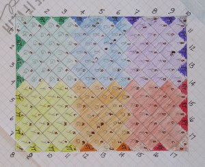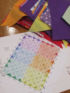 Blocks were passed to Linda H for assembling into a quilt top following a color-coded diagram prepared by Jane G.