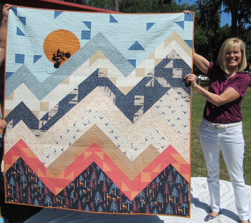 Jane @gonequiltinginflorida made “No Mountain Too High,” a 60″ X 80″ quilt for special friends who enjoy travel adventures while tandem biking. With help from her husband, Jane made a tandem bike silhouette that she raw-edge appliquéd to a mountain on the upper left. This pattern is “The Wilderness” by @artgalleryfabrics. She walking foot quilted it on her domestic machine.