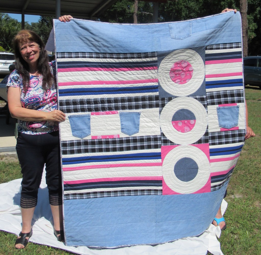 Karen @sunrayatplay made “Always Here,” a 54″ X 70″ memory quilt for a daughter-in-law, using t-shirts, jeans, and pajamas that belonged to this DIL’s parents. Karen chose the “Aurora” pattern from Heather Black’s @quiltachusetts book Quilt Modern Curves and Bold Stripes. (This book is in our library.)