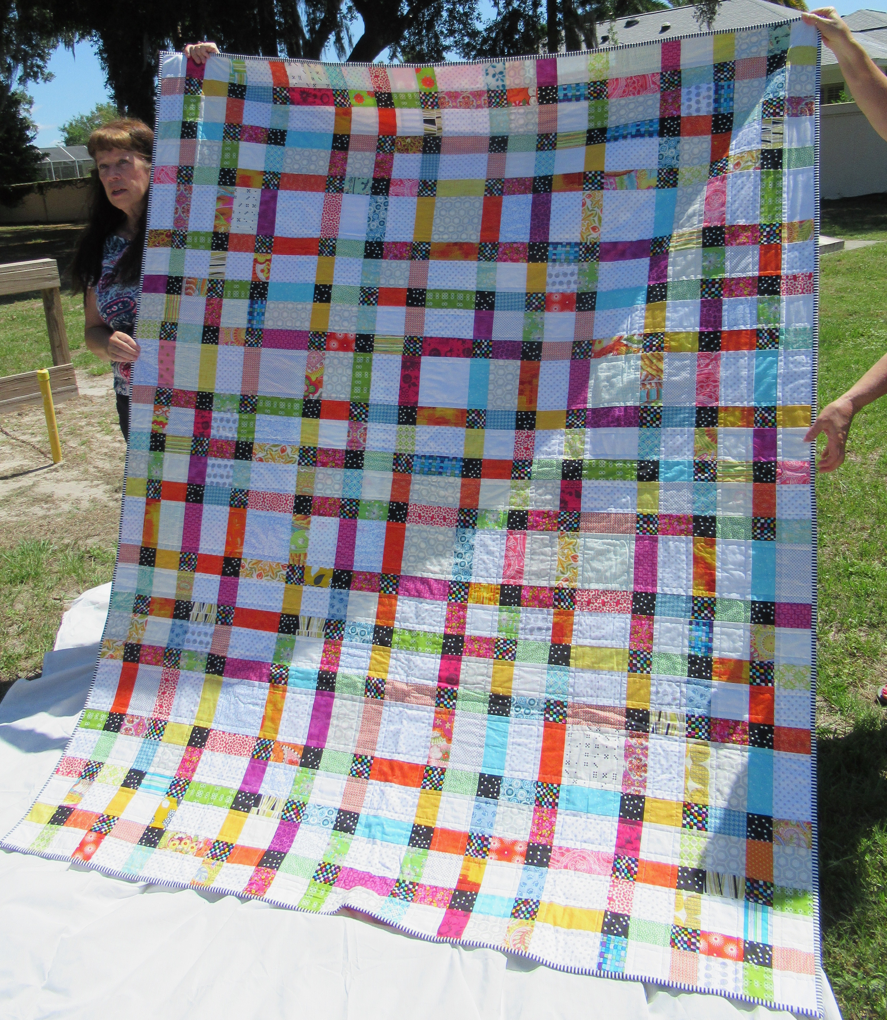 “Plaid-is 2” is a great scrap-busting, free pattern from Erica @KitchenTableQuilting. Karen walking foot quilted it on her Janome 9400.