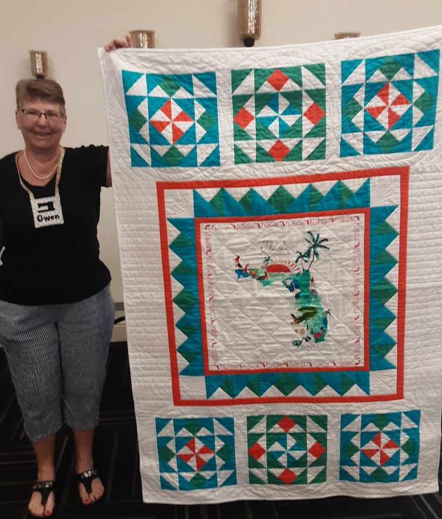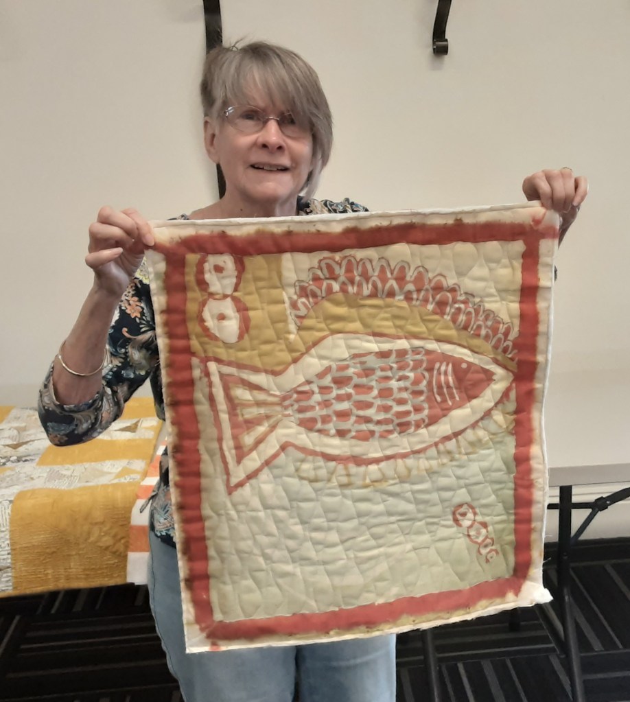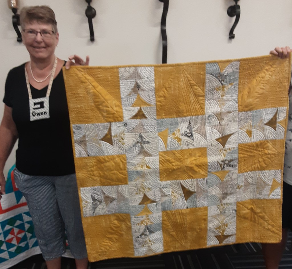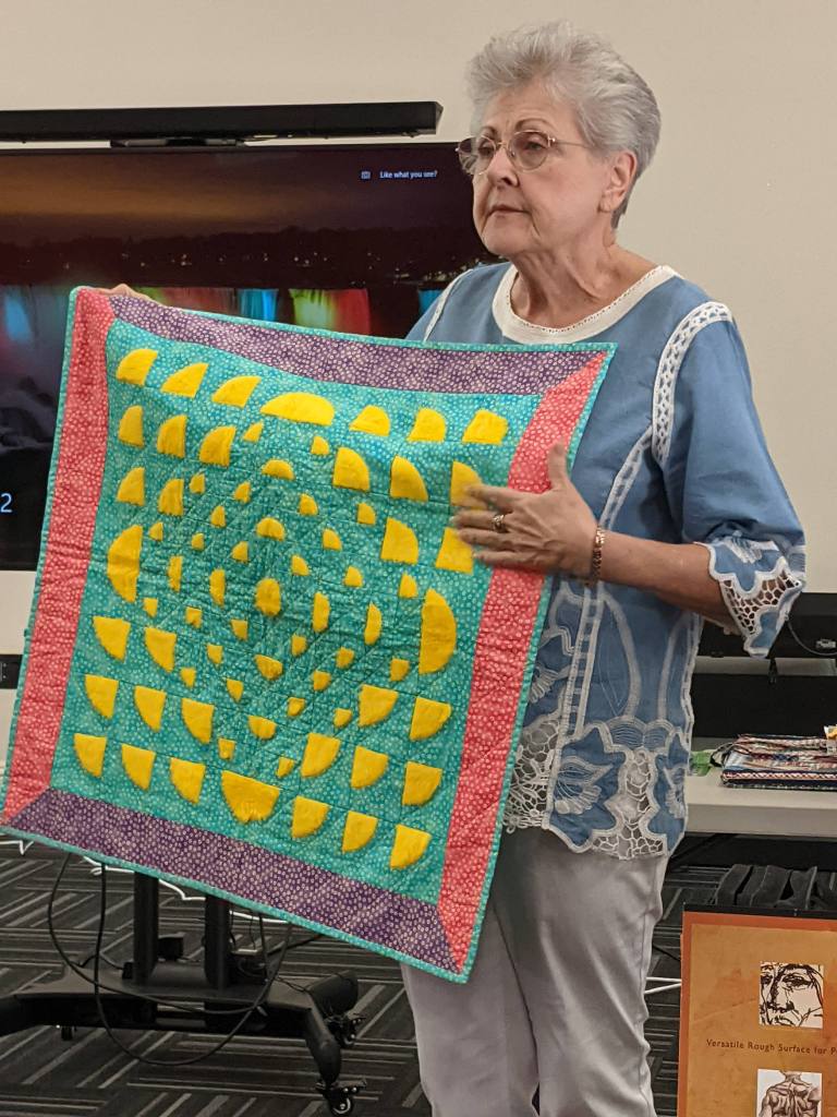 Carol shared a favorite quilt of her grandson. It is called “Vegetarian” and is about 29 by 29.5 It is a variation of the drunkard’s path block creating an optical illusion and completed on her domestic machine. The surprise is that the yellow fabric is fake fur.