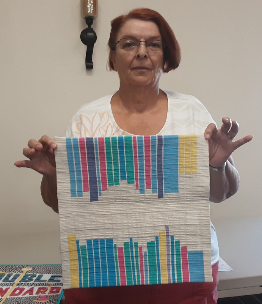 Beth @blue_dragonfly5 led the group in a hands on activity associated with NOTAN – two color quilts. Gwen and Jane brought in their two color quilts so we could mentally get set for two colors in quilts.