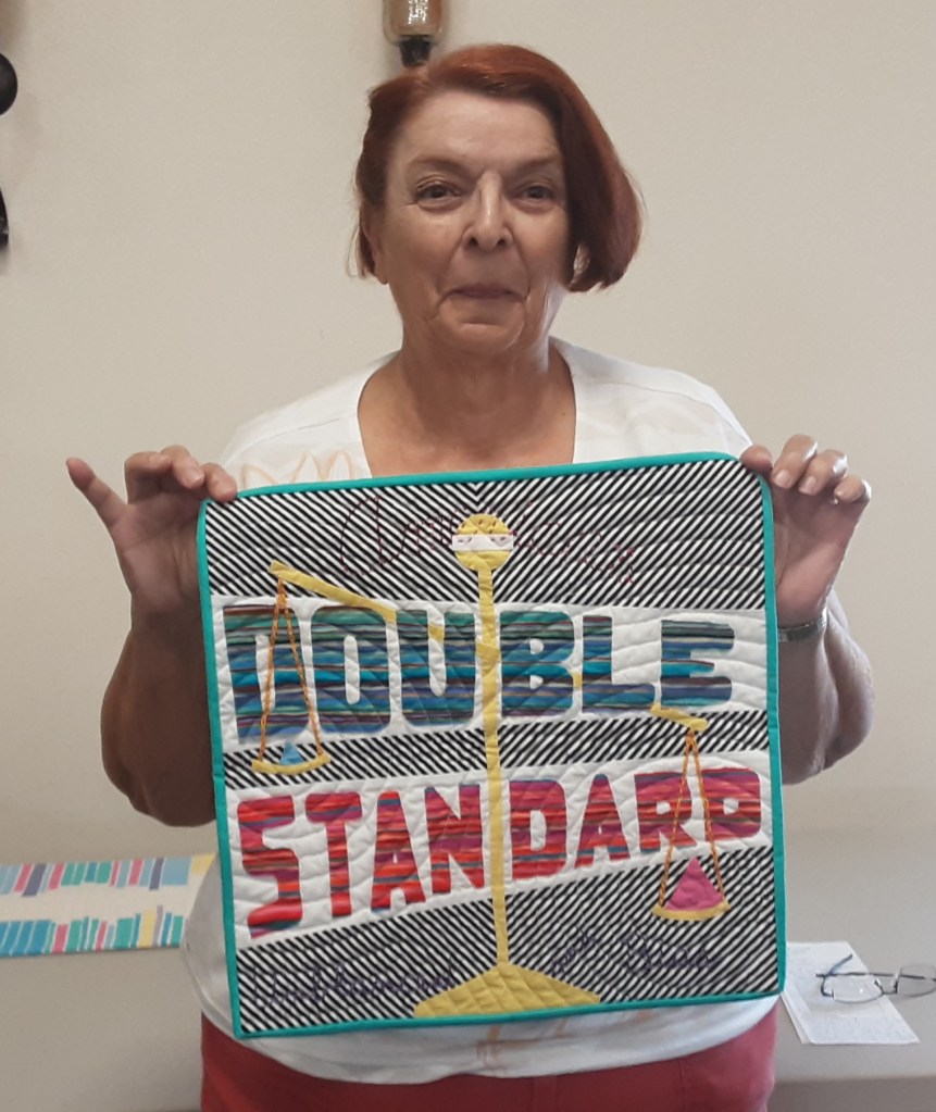 An entry in the Curated Quilts STRIPES and BALANCE mini challenge from Beth @blue_dragonfly5 is called “Double Standard.” It is an original design, 15 by 15 that was walking foot quilted on her domestic machine. Beth’s message: America’s Double Standard is unbalanced and biased is indicated with the scale of justice and hand stitched words.