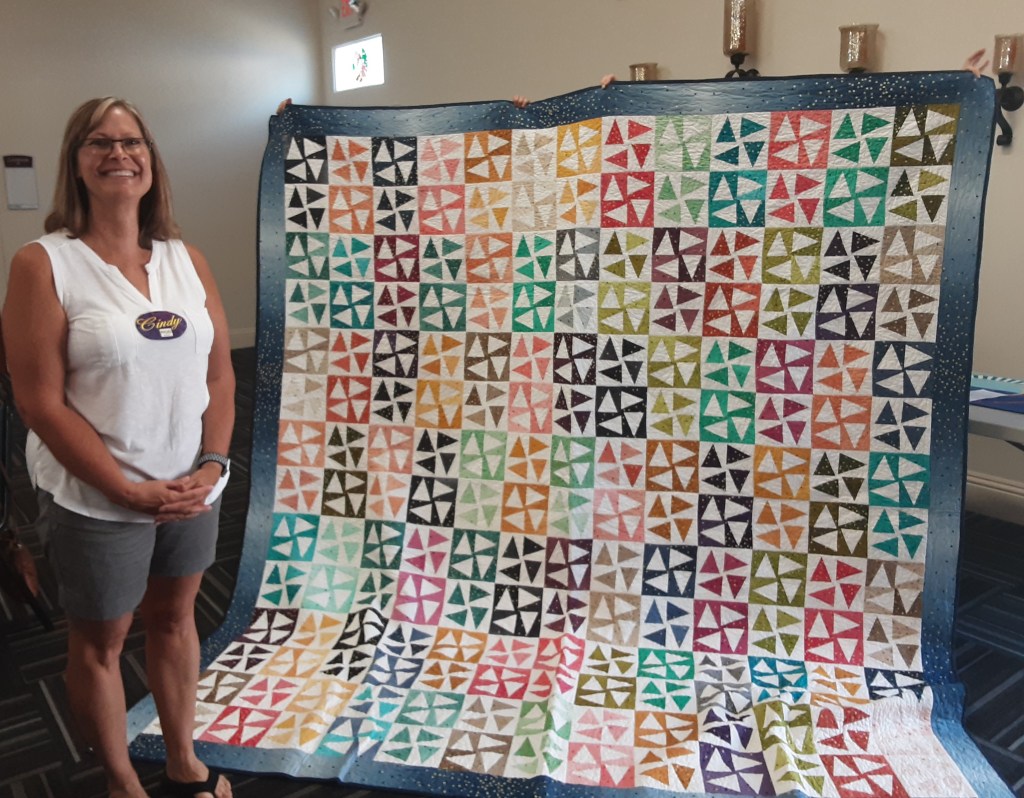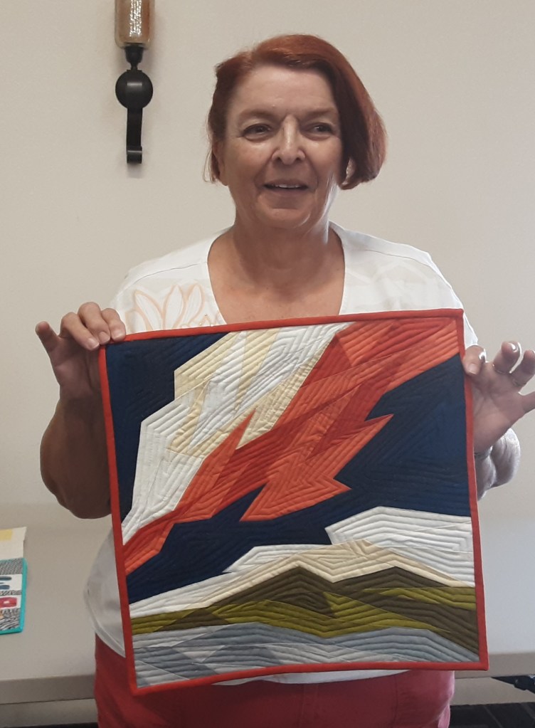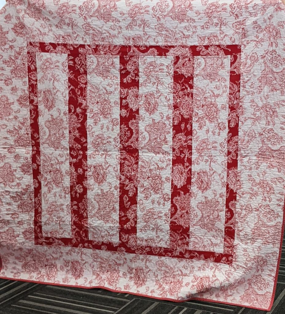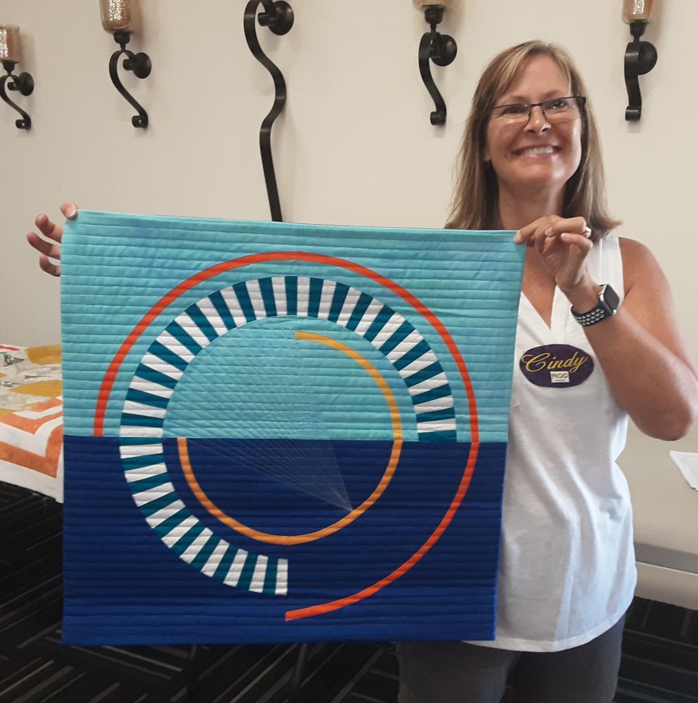 Cindy @cbubblesnsews utilized Audrey Esarey’s pattern (Cotton and Bourbon) and created “Indigo Radial” a 24 by 24 pieced template. Cindy tried to tell us it was easy if one pays attention to accuracy in cutting, sewing and the overall process. She quilted it herself on her domestic sewing machine.