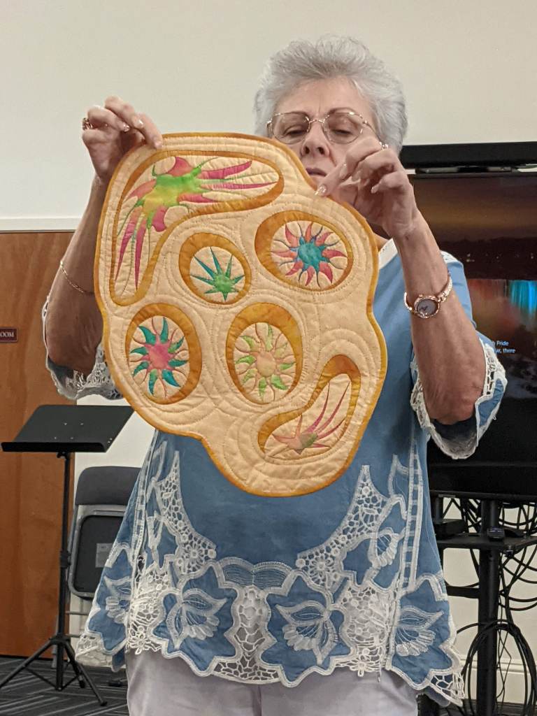 Margaret @redhotbobbin shared her son’s art project which he painted on fabric. She wanted to pull elements from the painting into her quilting with her APQS Millennium longarm. She smiled as she said her son remembers exactly when he painted it. Currently it is finished as an 18 by 18 wall hanging, but she is thinking of making “Byrne’s Art Class Project” into a pillow. What a treasure!