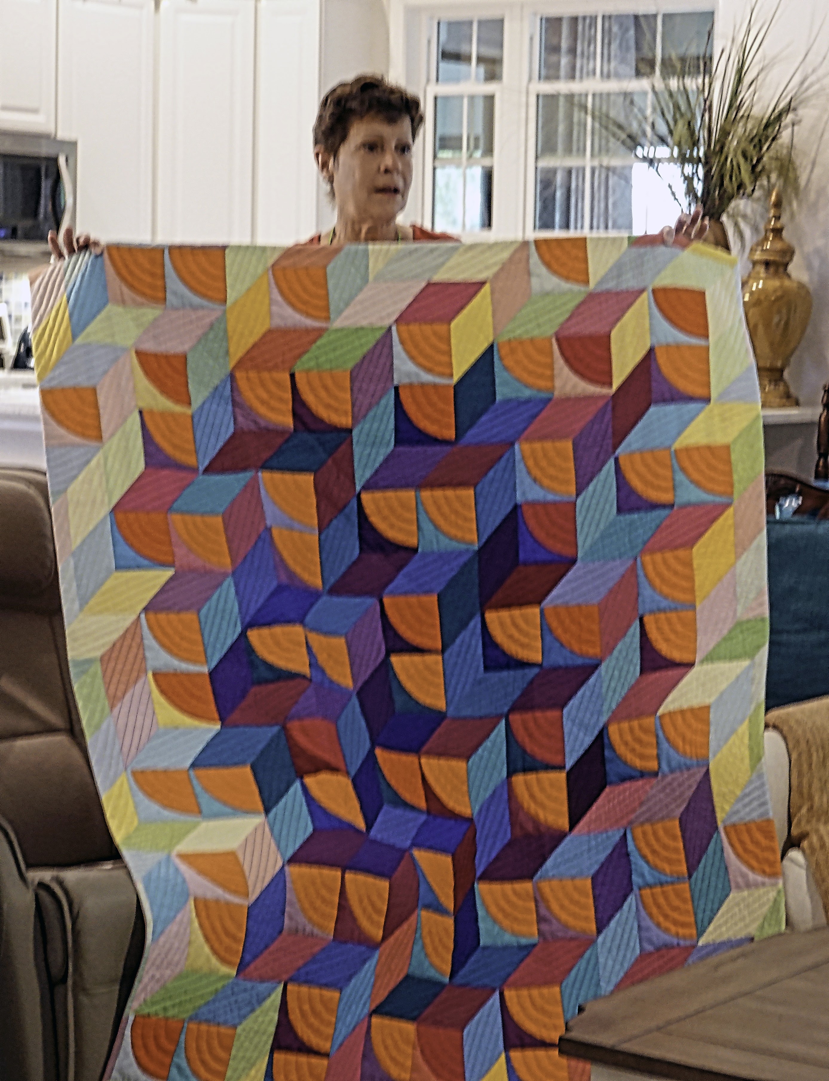 Linda’s inspiration was Victor Vasarely, specifically “Hommage a l’Hexagon” as seen here. She quilted VV (working title) on her Bernina with 28 wt Aurifil and the batting is Wool Quilter’s Dream. It finished at 48 by 64 1/2. And she used fabric in her stash to create the pieced back. Linda liked the depth and dimension within Vasarely’s work and hoped to carry it into her quilt.