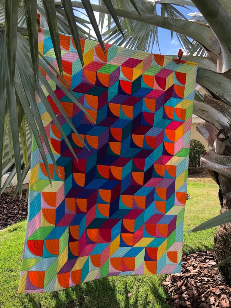 This original design was inspired by the works of Victor Vasarely and was part of the CFMQG challenge in January 2020 where chapter members could pick one of several Mid Century Modern Artists and their works to create a quilt. The challenge was due in April 2020.