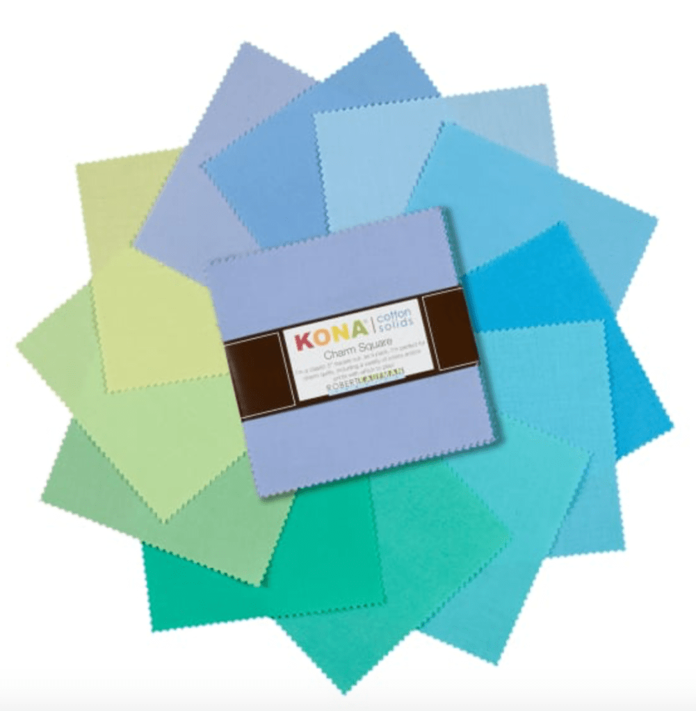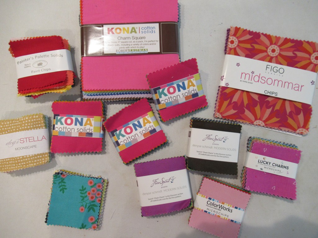 If you’ve collected a pile of chip packs – 2½” square pre-cuts often given away by vendors at QuiltCon – and/or a pile of charm packs – 5″ X 5″ pre-cuts – it’s time to put your creative thinking cap on to make a quilt with them!