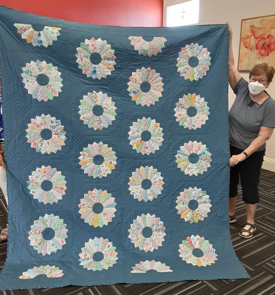 Let’s start with Show and Tell. We only had two quilts to see, but there was a theme. Both quilters used fabric that their Mother had used and or saved from the 1930’s and 1940’s. The fabric was from flour sacks with different results and both were beautiful!