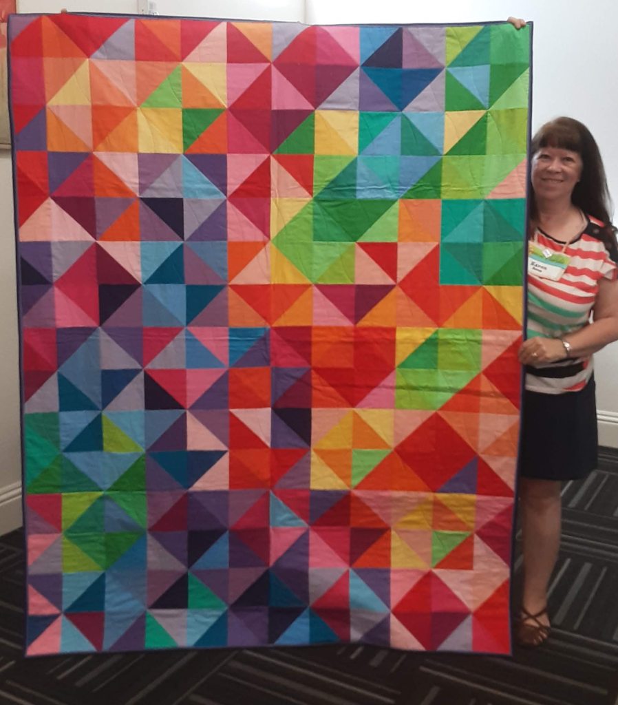 Karen @sunrayatplay presented POSTCARD FROM SWEDEN a design that was inspired by Tom Fraziers IKEA Kort Art Cards. Karen used 36 different colors to make this 60 by 75 quilt that quilted on her Babylock Tiara. The pattern is free at stashfabrics.com and was designed by Kelly Liddle for Jeli Quilts.
