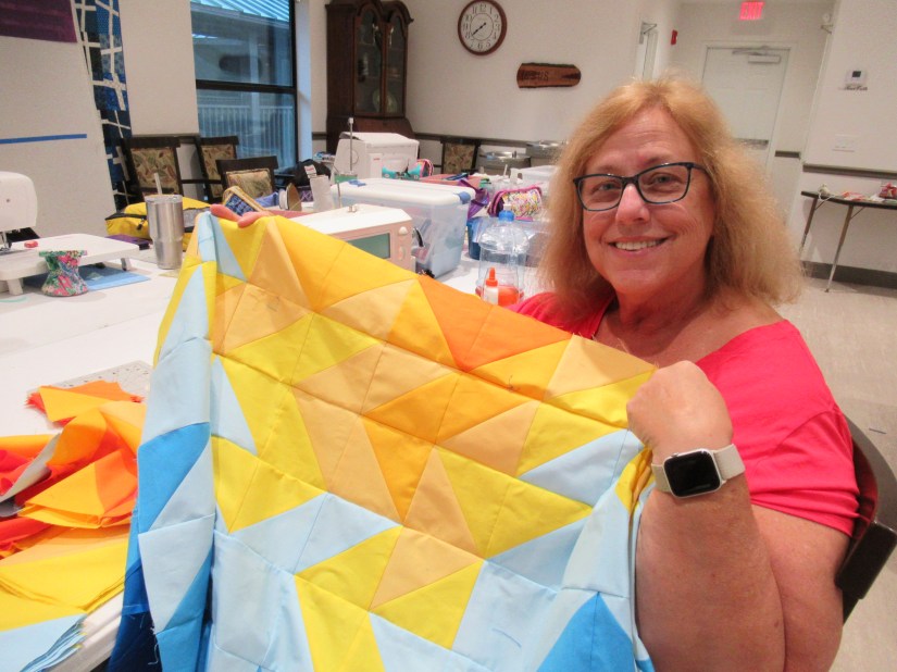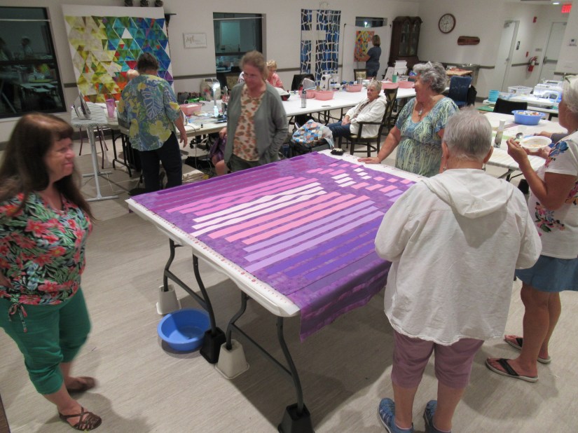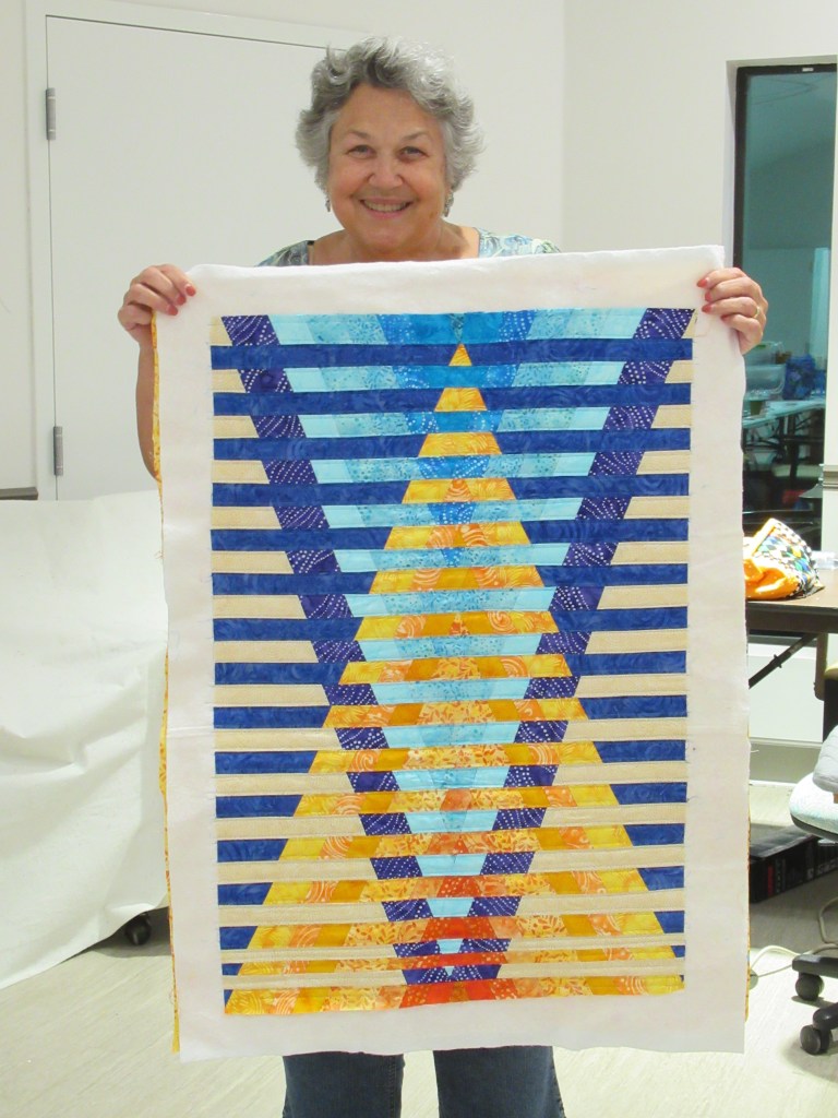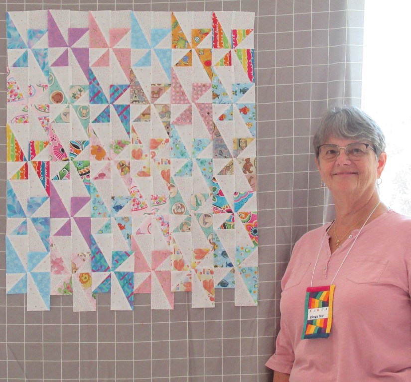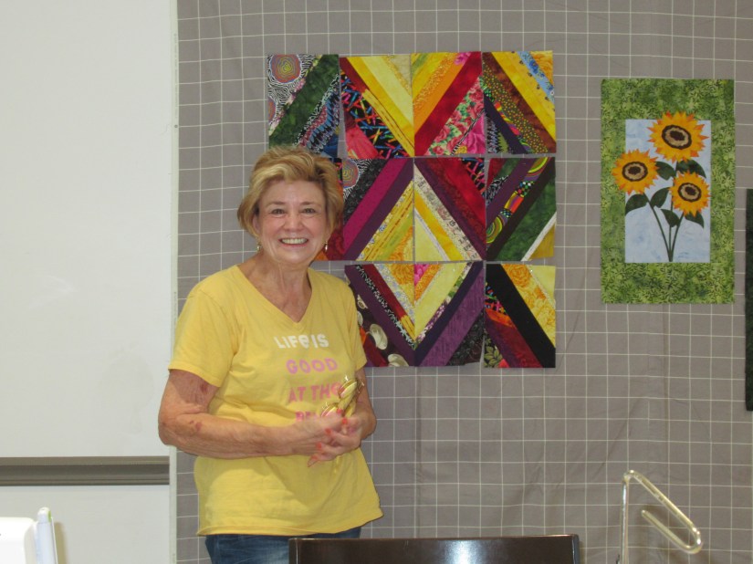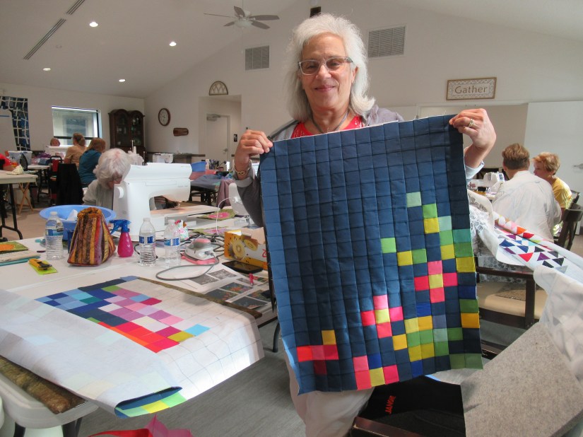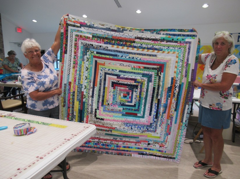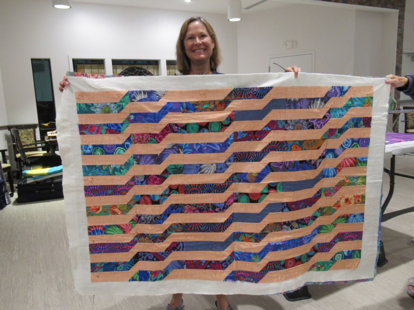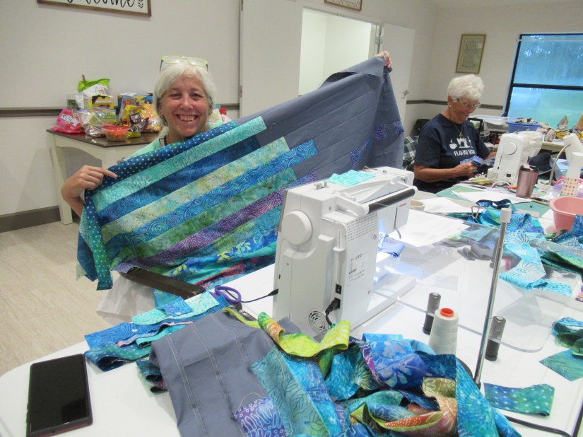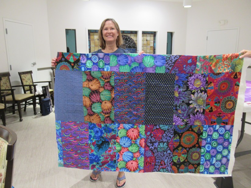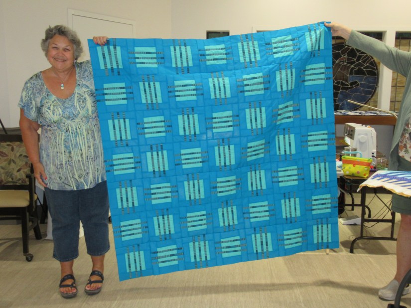 Quilters with their in-progress, or completed tops, or completed quilts, in photo order are: Char, Carol, Beth, Sandi, Janice, Barbara, Judy, Kathy, Mel, Janice (with Mel), Patti, Patti, Patti (Yes! Patti was a prolific finisher!), and Cindy with the front and back of the same quilt.