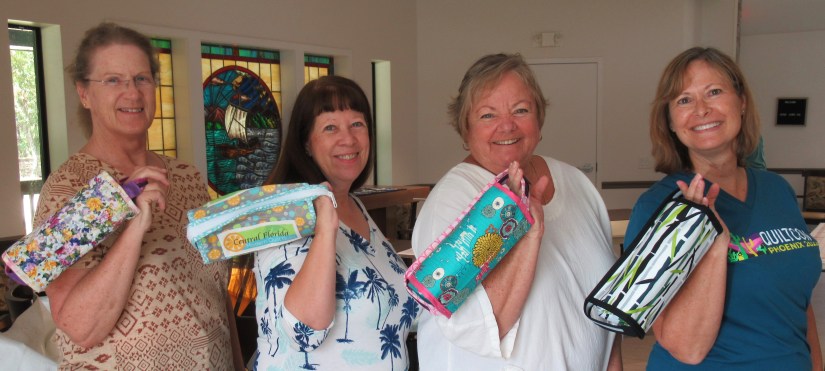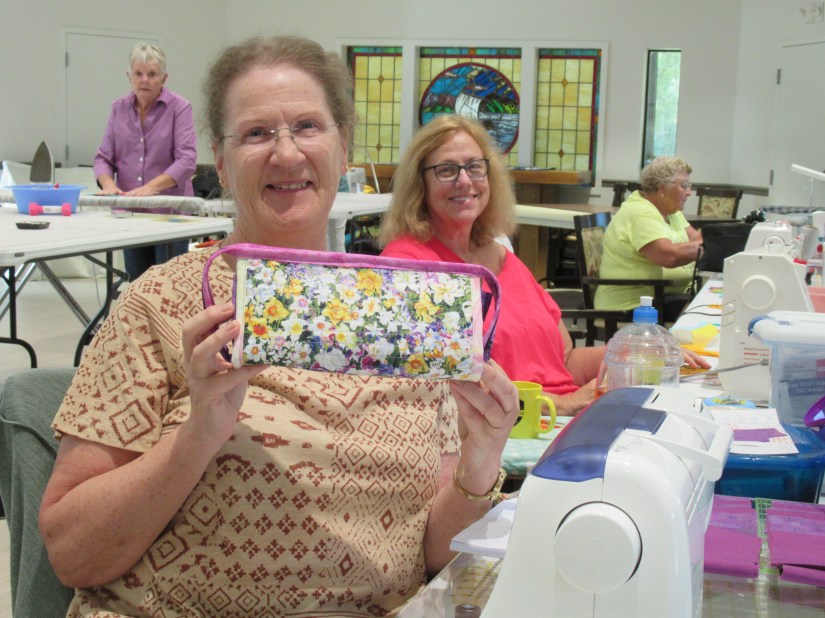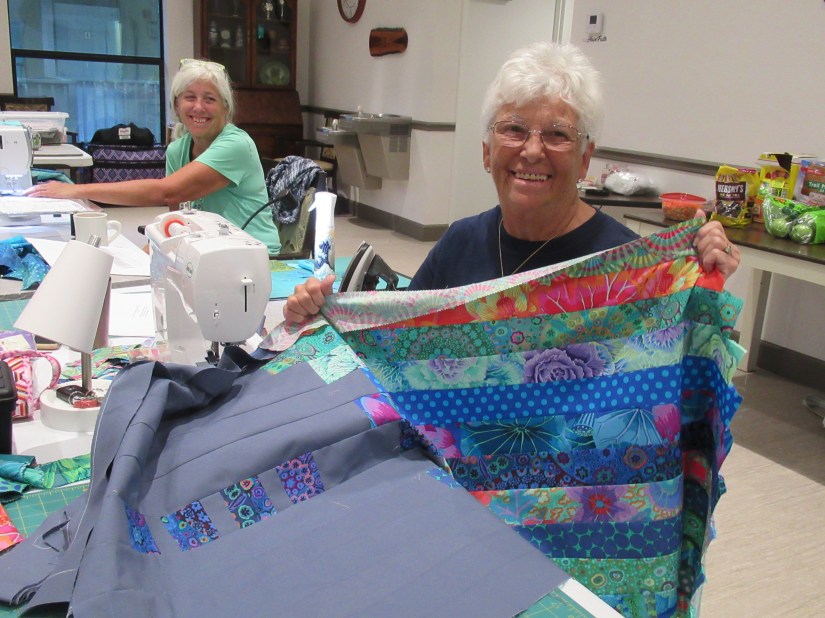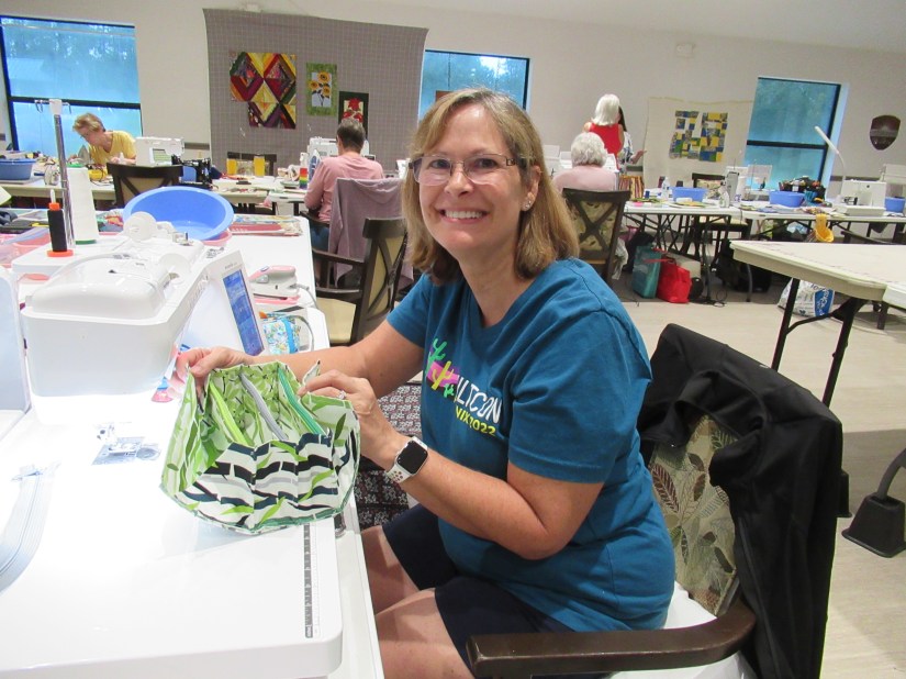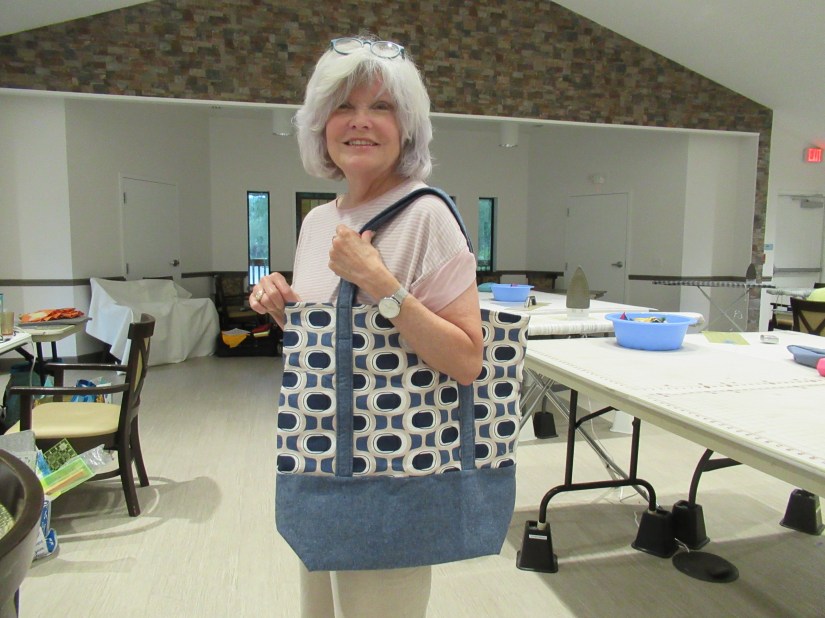 Four “bag ladies” made the same project, the Sew Together Bag by SewDemented. Posing with Sew Together Bags over their shoulders (last photo) are: Mary, Karen E., Karen T., and Cindy.
