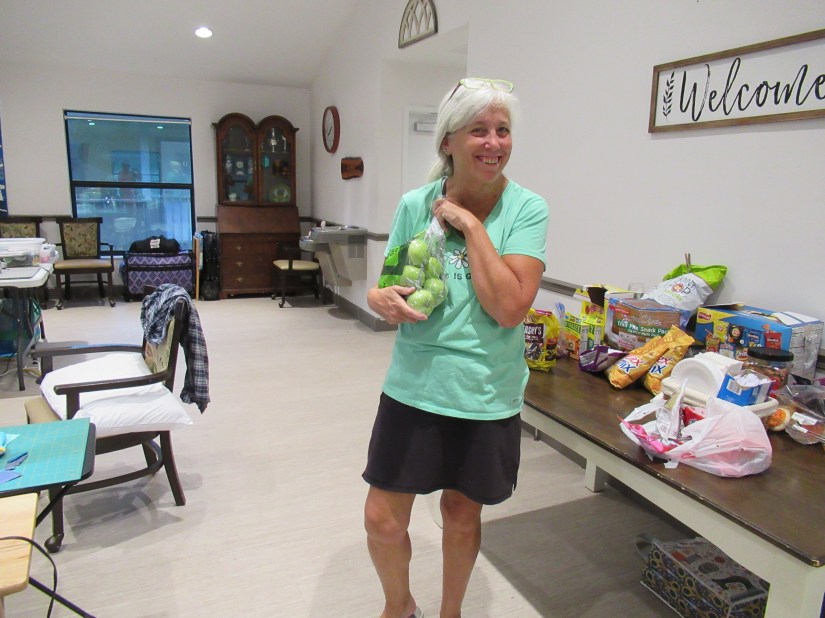 When apples weren’t a “hot ticket,” she took some creative initiative and made them more appealing – Sloshed Apples? (What happens at quilt retreat stays at quilt retreat!) Thank you Mel and Cindy!