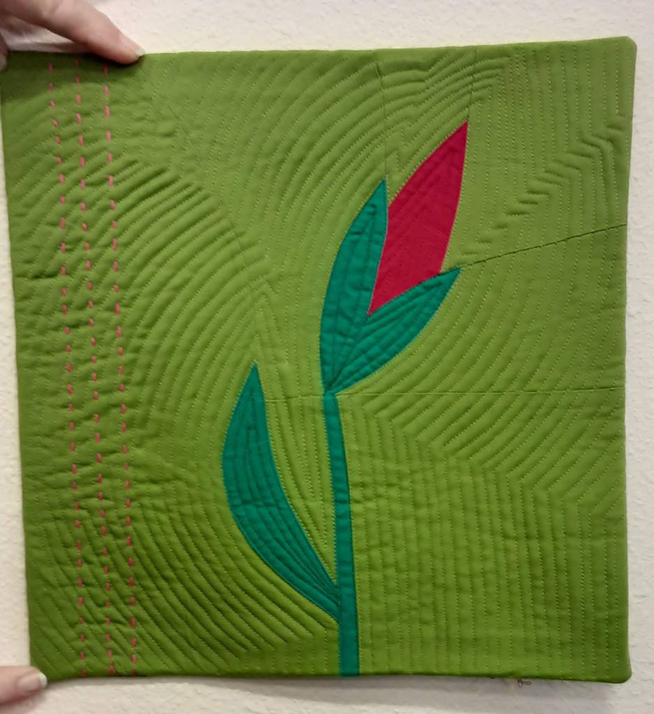 Our smallest Show and Tell was from Beth @blue_dragonfly5 called ROSEBUD measuring 15 by 15. It is an original design using freezer paper piecing from her sketch along with curved piece sewing. It has a faced edge and uses negative space, minimalism and asymmetrical in the design. Beth quilted it with her walking foot, echo stitch and big stitch hand quilting.