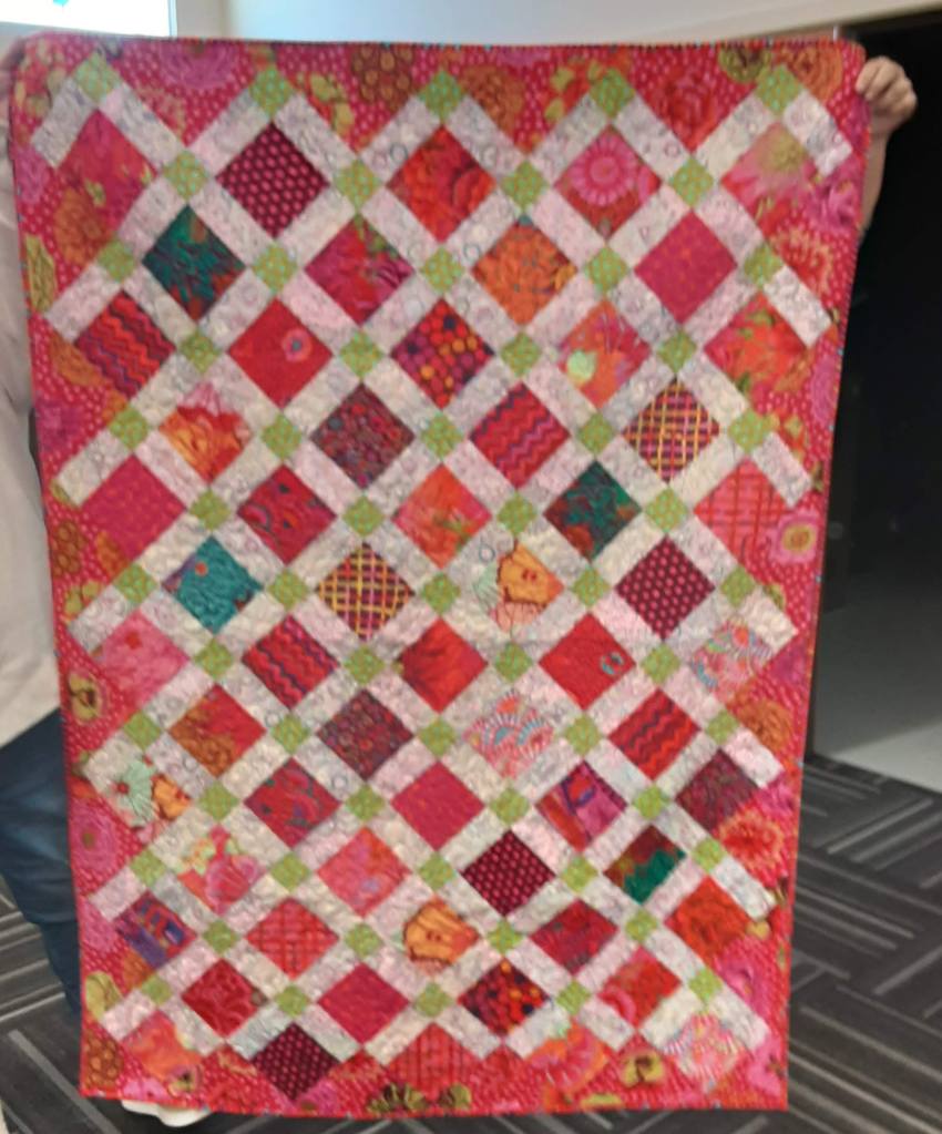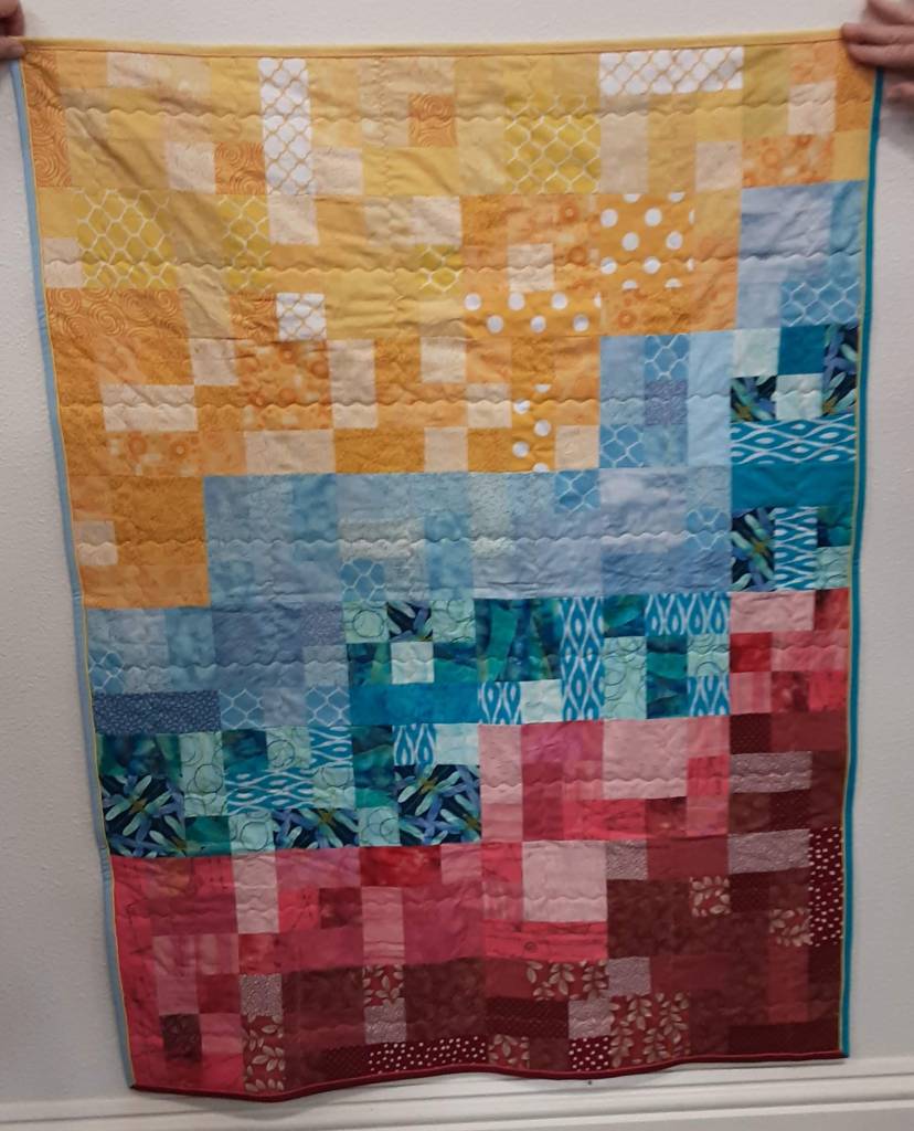 SCRAPPY BLOCKS was made using the Scrap Snap block pattern. This original arrangement measures 36 by 48 and was made by Beth @blue_dragonfly5 with no borders, bright fabrics, high contrast and asymmetrical in design. It has a corded binding. This is also the first quilt that Beth’s daughter Pam quilted using a serpentine stitch with a walking foot. Some new mother from Healthy Families Florida will enjoy this baby quilt.