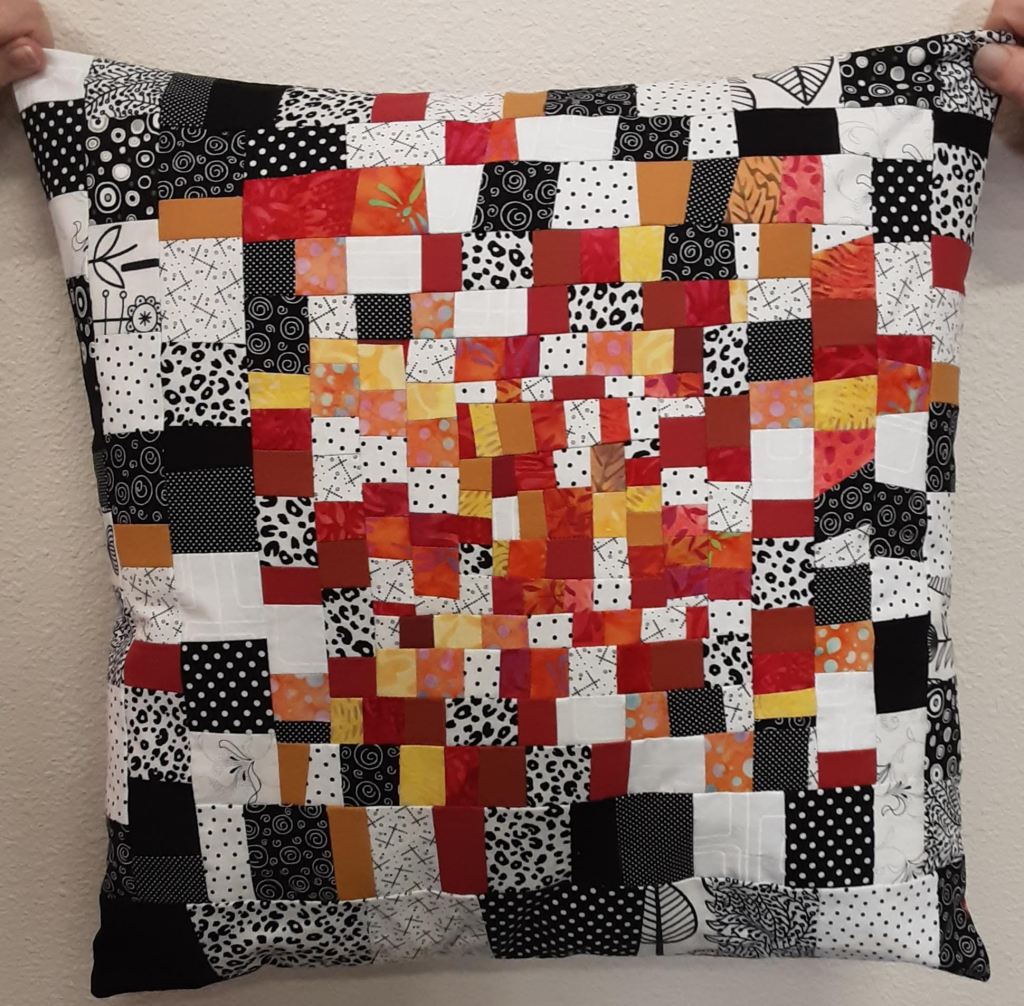 Gwen used tiny piecing learned from Debra Jalbert in 2018 and completed this pillow called CRABBY FALL measuring 16 by 16. There are no borders, bright fabrics and high contrast in this design and the end result is a usable pillow!
