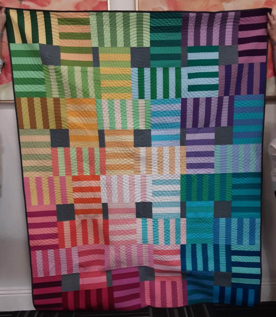 Shloe @quiltraven created a Kaffe Nine Patch with bright fabrics, just for fun. Quilted by her friend Pat Barry with an edge to edge design. Something that goes together fast and is simple to do.