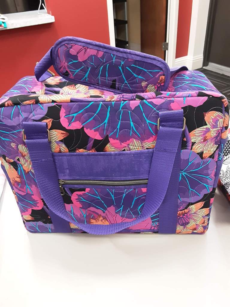 Ardie @fatquarteraddict did some research about personal item bags for flying. This measures 6 by 12 by 16 and was designed by Ardie to fit 95% of airlines associated with carryon requirements. Quilted on the Handiquilter using bright fabrics. Ardie has made a couple of these and told us – “you can make them fun!” The one shared with Show and Tell is a gift.