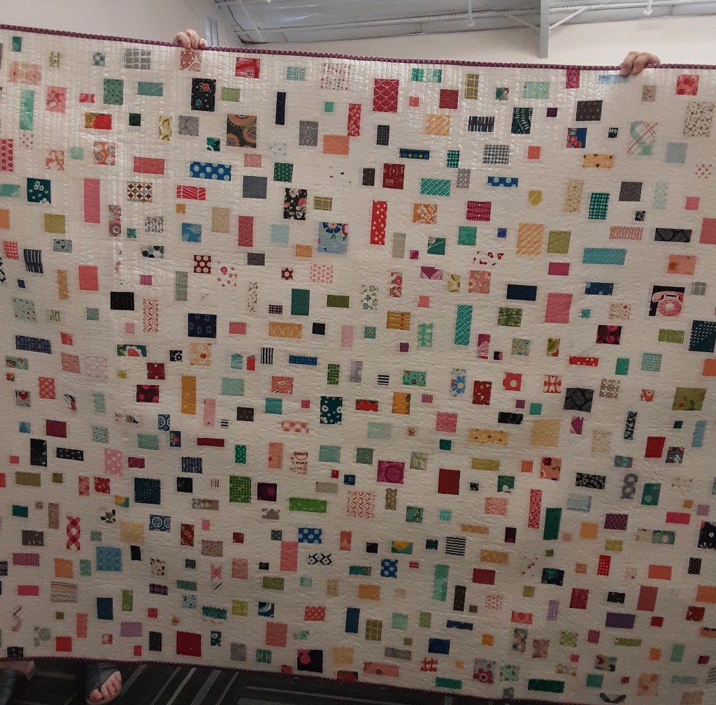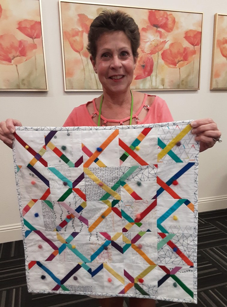 Linda @flourishingpalms shared two newly completed items during Show and Tell. Her first item was a COMPLETED project from a workshop taken during QuiltCon 2023. It is called CROSSCUT and measures 21 by 21. Crosscut was a free tutorial by Debbie Jeske @aquilterstable which Linda prepared for her workshop “Reimagine the Classic Tied Quilt” by Laura Loewen @quiltfortco