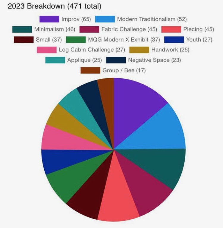 Our meeting had a full discussion with photos of QuiltCon 2023. Over twenty members were in attendance and they selected their quilt favorite and identified trends they saw on the showroom floor. Members enjoyed seeing the show through their eyes. An important piece of information was shared regarding the quilts entered in 2023. Improv had the most quilts, so, congratulations again to Jane @gonequiltinginFl and Linda @flourishingpalms who both had quilts in that category. Below you see the breakdown.