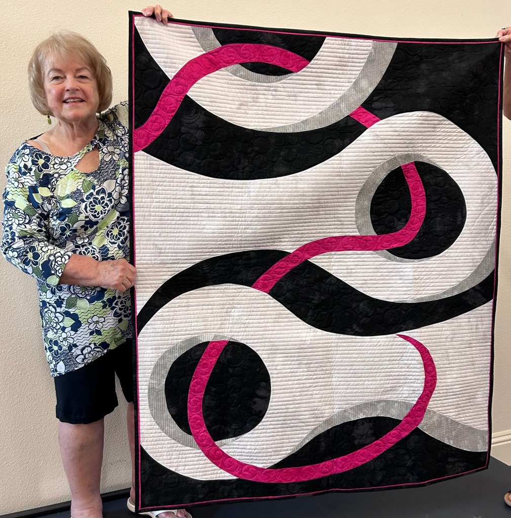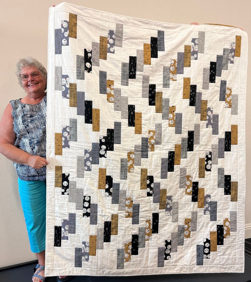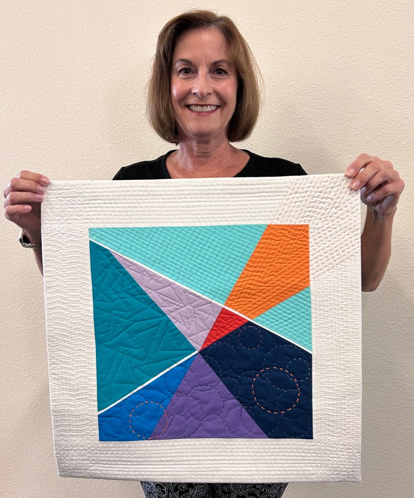 Mel is holding a quilt made by her mother, Janice. It’s New Additions, a pattern by Kelly Marshall of Simply Mackbeth. The quilt is 40″ X 40″ and was quilted by Janice.