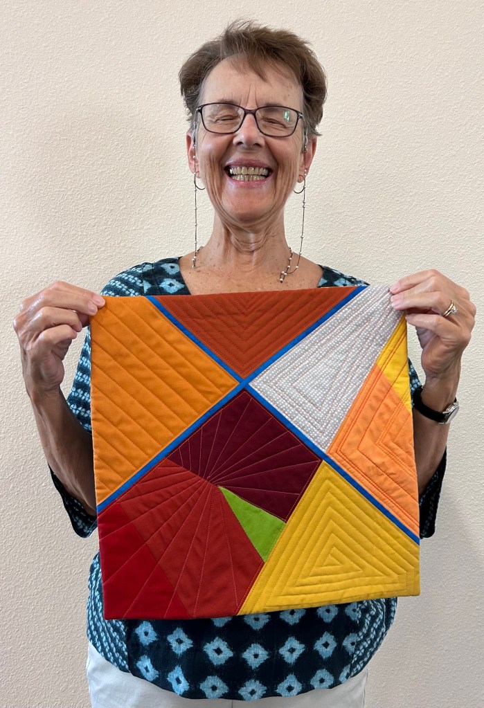 Donna P @donnapquilts made What’s Your Angle? as a result of Karen E.’s April “What’s Your Angle?” workshop. Donna’s quilt is 20-1/2″ X 20-1/2″. She used Quilter’s Rule Circle rulers and her Sashiko machine for quilting, adding hand stitching with chunky thread. The quilt has a faced finish.